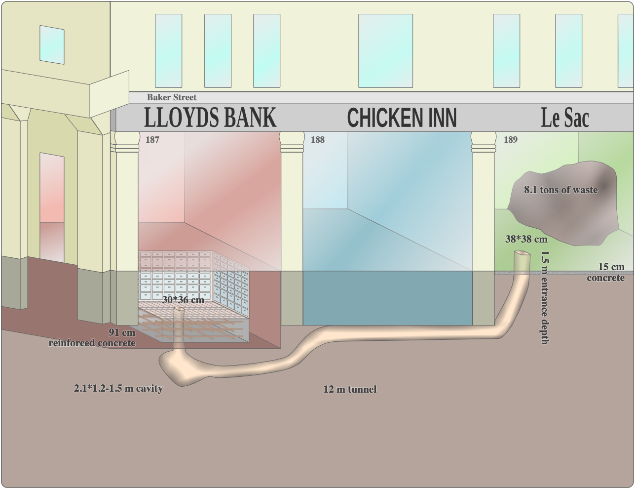The Baker Street robbery, carried out on the night of 11th September 1971, was the burglary on safety deposit boxes at the Baker Street branch of Lloyds Bank in London. A gang, led by career criminal Anthony Gavin tunnelled 40 feet from a rented leather goods shop, Le Sac, two doors away to come up through the floor of the vault. Inspired by the Sherlock Holmes story The Red-Headed League, Gavin and his colleagues spent weekends tunnelling into the bank where they emptied 268 safety deposit boxes. The total value of the stolen property is unknown but was estimated at between £1.25 million and £3 million, though only £231,000 was ever recovered by the police. The burglars used walkie-talkies to communicate with a lookout stationed on a nearby rooftop, but their transmissions were accidentally intercepted by amateur radio enthusiast Robert Rowlands, who alerted the police.