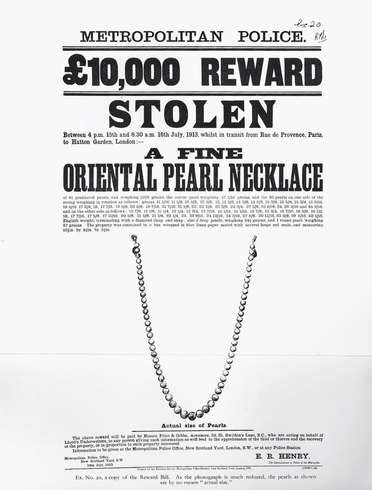 The Great Pearl Robbery took place in 1913 and centred on a necklace known as the ‘Mona Lisa of pearls’ - a string of 61 flawless blue-pink pearls with a diamond clasp, regarded at the time as the most valuable necklace in the world, and worth more than the Hope Diamond. Owned by jeweller Max Mayer, the necklace had taken over a decade to create, with its centrepiece pearl once belonging to the royal family of Portugal. The theft was planned by Joseph “Cammi” Grizzard, a well-known jewel fence, who, with accomplices Simon Silverman and James Lockett, devised an intricate plan to intercept the necklace as it was being returned by post. Silverman rented an office near Mayer’s in Hatton Garden, studied the route and habits of the postman, W.E.Neville, and even produced imitation seals in the style of Mayer’s.