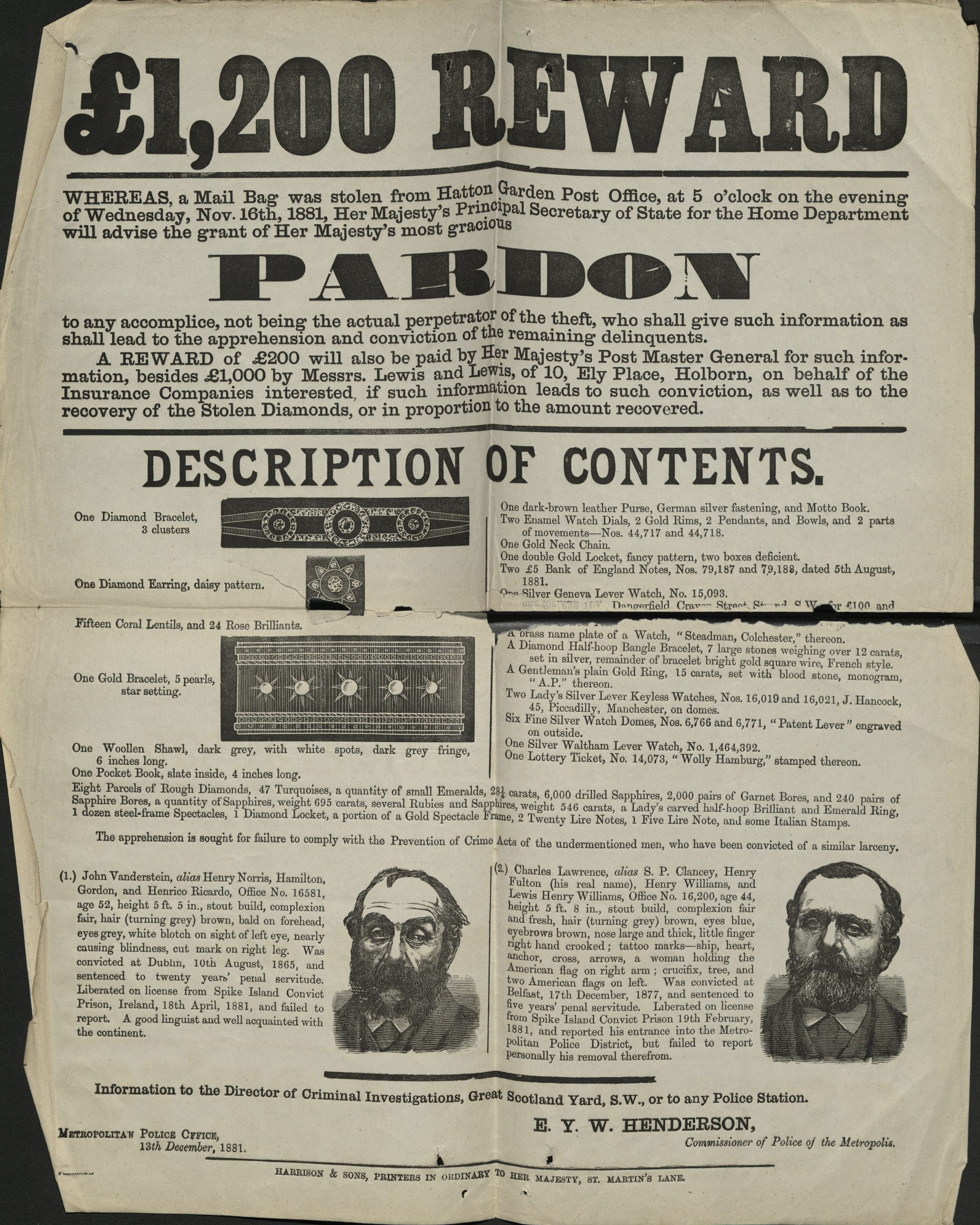 In November 1881, the Hatton Garden Branch Post Office, situated in the busy district of Holborn, became the scene of a bold and meticulous robbery. At around 17.00, when the work in the Post Office was at its height, the lights suddenly went out and the building was plunged into near-total darkness. Panic broke out among the female clerks and young boys in the offices and warehouses, adding to the chaos and confusion on both sides of the counter. It wasn’t long before they discovered that the tap of the gas meter supplying the office lamps had been turned off. Once the gas lamps were relit, a mailbag of forty registered letters was noticed to be missing. The stolen letters were valued at £80,000 - more than £10 million today - and contained an extraordinary amount of precious stones and jewellery, including pearls, diamonds, emeralds, sapphires, garnets, and rubies.