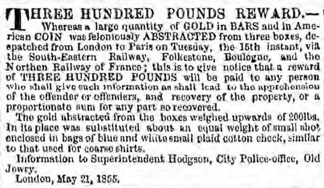 On 15th May 1855, one of the most notable train robberies in British history took place when a routine shipment of three boxes of gold bullion and coins were stolen from the guard’s van of a South Eastern Railway (SER) service travelling from London Bridge to Folkestone. The shipment was on its way to Paris, but by the time it arrived, the safes were empty. The crime was carefully planned by Edward Agar, a career criminal, and William Pierce, a former SER employee who had been dismissed for gambling. After his dismissal, Pierce continued to frequent pubs around London Bridge, where he picked up information about the methods and schedules of gold shipments from railway workers. Realising that a theft would only be possible with copies of keys to the safe, access to staff rotas, and insider cooperation, he and Agar recruited William Tester and James Burgess, two employees of the SER, to their scheme.
