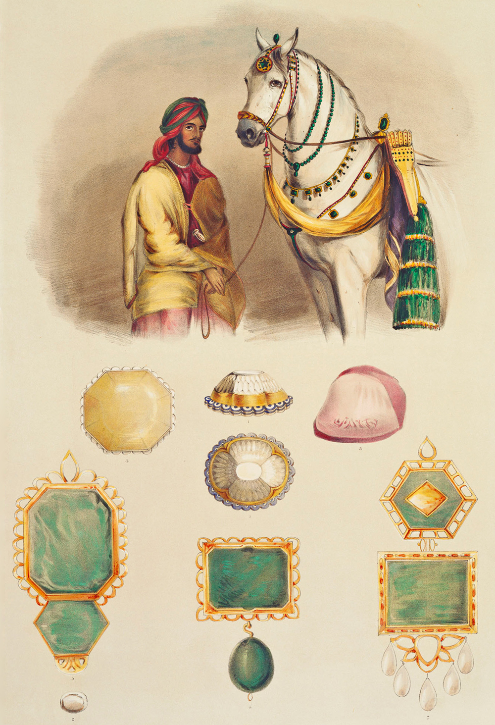 One of Ranjit Singh's favourite horses with the head of his stables. His jewels are shown, to scale, including the Koh-i-Noor (top centre).