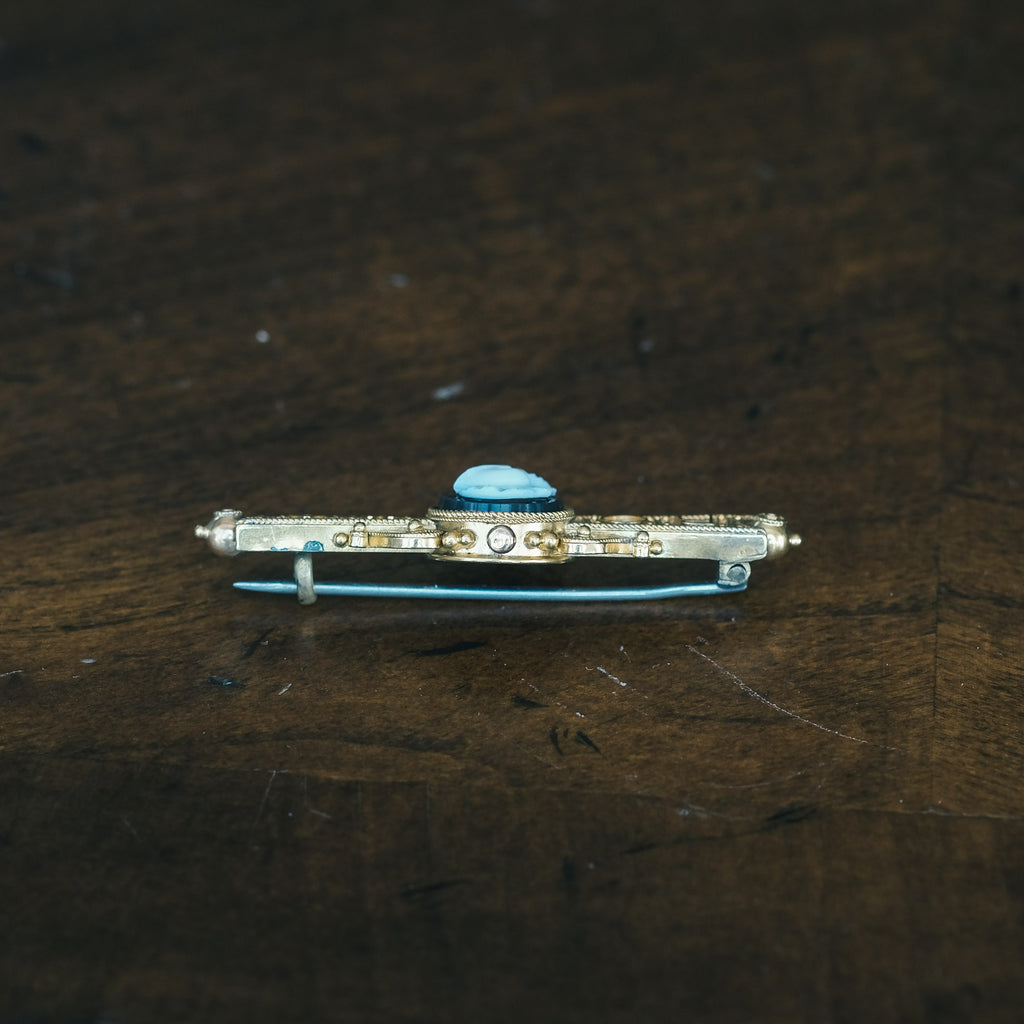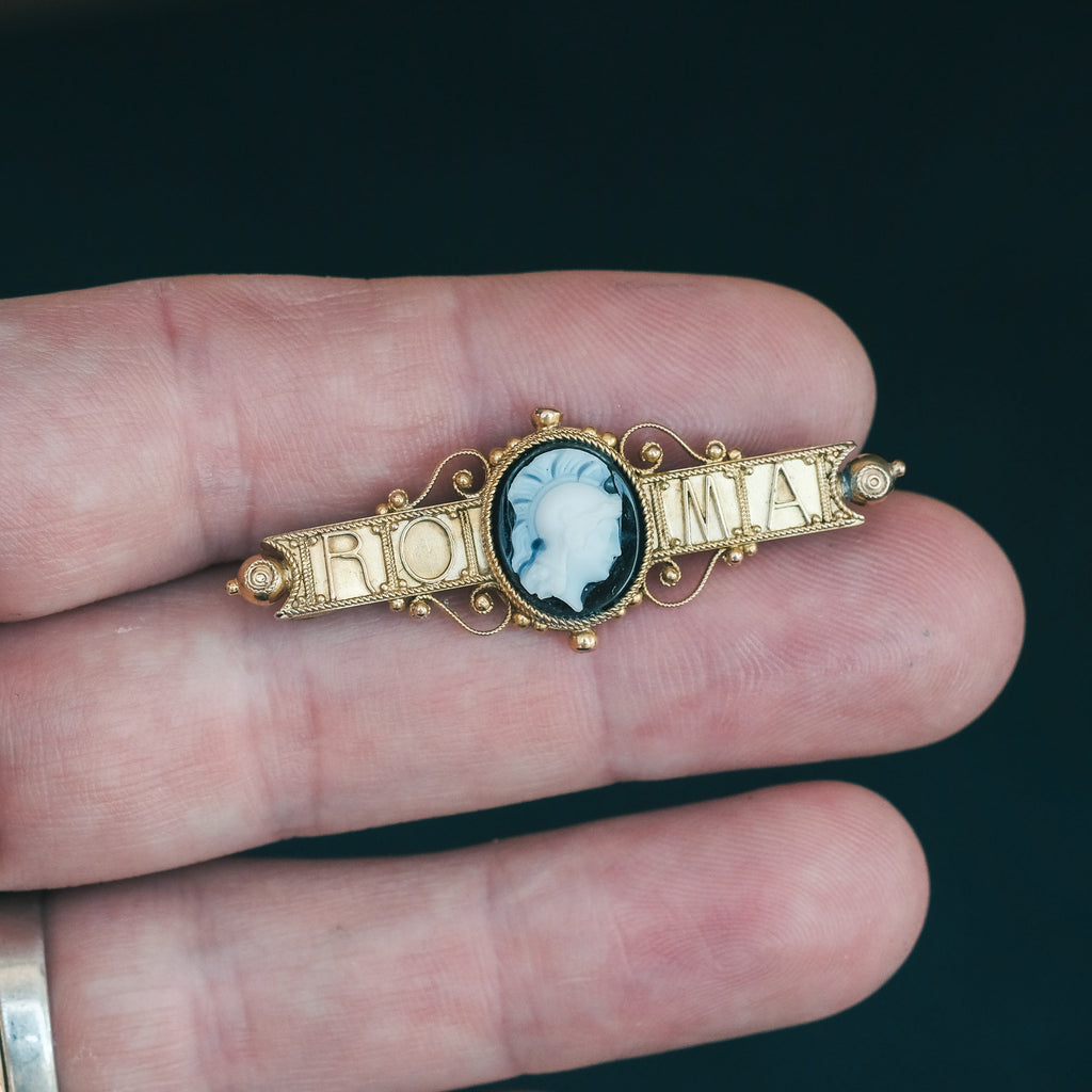 ROMA. The crowning jeweller of any Grand Tourer's European sojourn. This brooch incorporates all of the elements required to prove your mastery of European culture and knowledge, from the central hardstone cameo (depicting Minerva, naturally) to the Etruscan Revivalist gold-work. And for any lowbrow brute who, having glanced at your dazzling Grand Tour memento, still doesn't get it, the word ROMA is emblazoned across its length. Because you've been there and you've experienced it and now you are very clever.