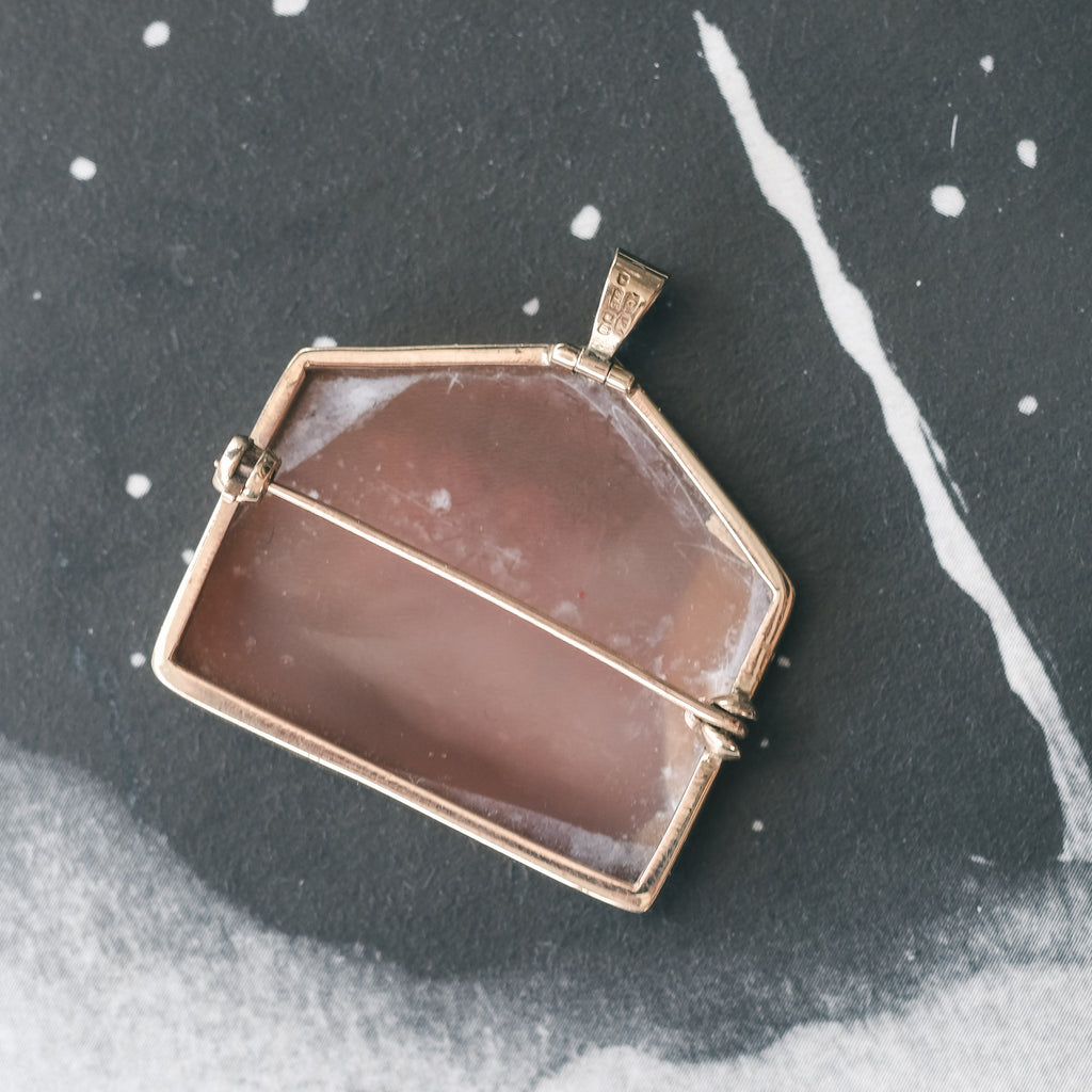 An unusually shaped nineteenth century shell cameo depicting four cupids (or perhaps putti) frolicking in the sea with dolphins. The detail is exquisite with whispy clouds above and hazy mountains in the background, the artist who carved using the natural white banding to incredible effect. It's set in a later gold brooch mount in the Victorian style, with hinged bail for wear as a pendant (the hallmarks date the mount to the 1990s, but the cameo itself was carved around 1850).