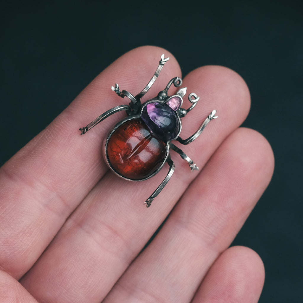 Incredible Victorian beetle brooch crafted in silver and set with juicy, gummy-like paste cabochons: blood-orange red for the abdomen, vibrant pale purple thorax, and a pink head. English, circa 1900.