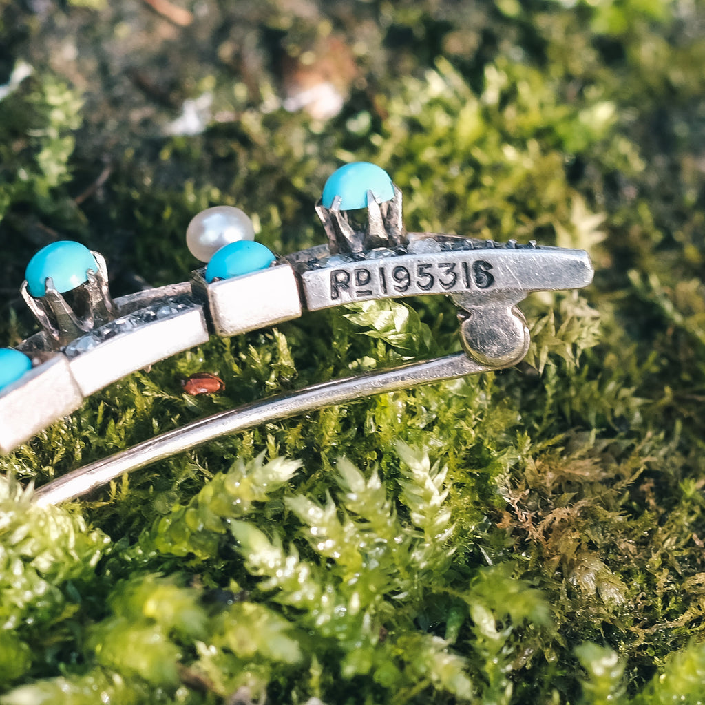 Sublime Victorian crescent moon brooch dating from the latter half of the 19th century, circa 1880. The crescent has a thin, shallow profile and it's liberally set with gemstones: turquoise, diamonds, and pearls suspended between ribbon-like swags beneath. Each of the three main turquoise stones are set into square 'compartments', the rosy hue of the gold complementing their colour beautifully. Indeed, whomever made this brooch was so please with how it turned out that they decided to register the design. It's crafted in 15 carat rose gold and silver.
