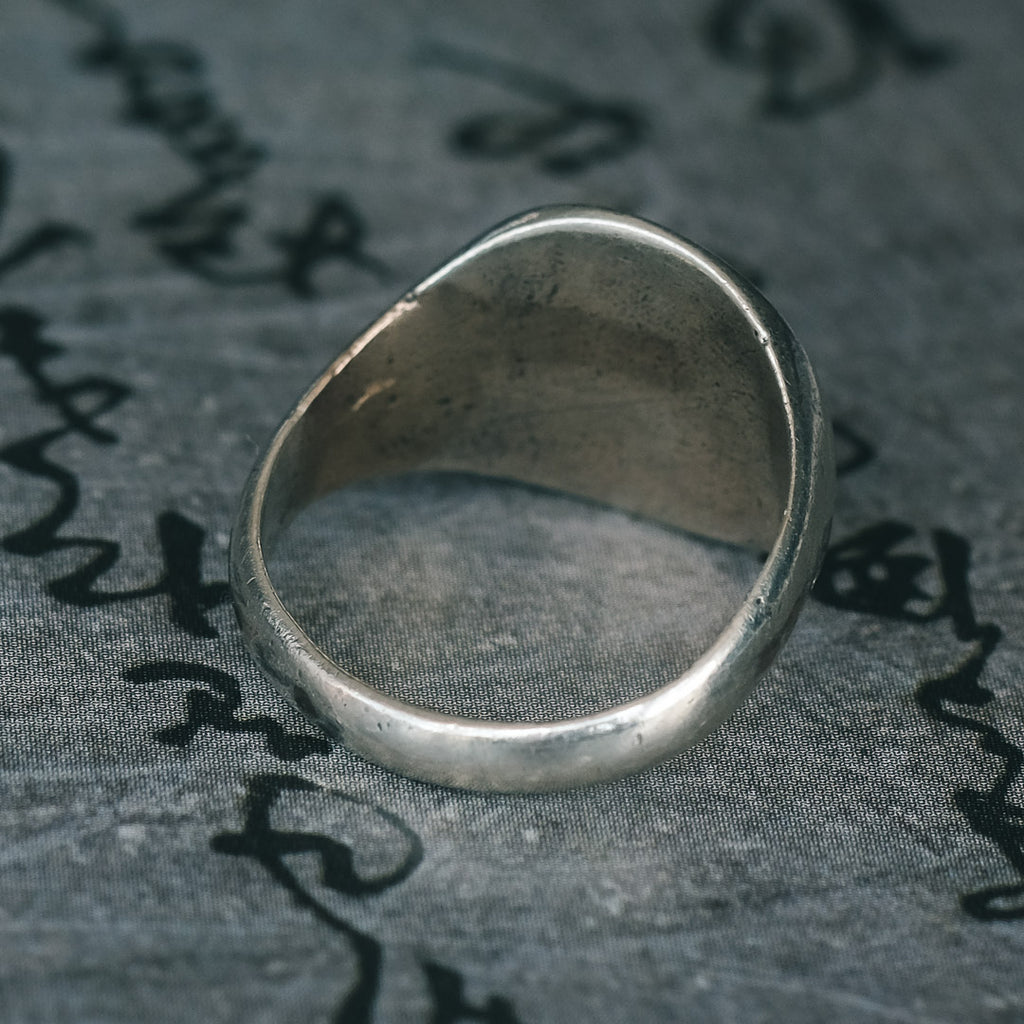An unusual white gold signet ring depicting the Capitoline Wolf, one of the Roman origin stories involving the iconic she-wolf, Lupa, suckling the infant twins Romulus and Remus. Or does it? The city of Sienna has a traditional story about another pair of founding twins who were also suckled by a she-wolf, and these twins - Senius and Aschius - were the sons of Remus himself, the pair having fled Rome after the death of their father at the hands of their uncle Romulus. Depictions of a she-wolf and twins are common in the city and, notably, they sometimes feature a tree in the background - just like the depiction on this ring.