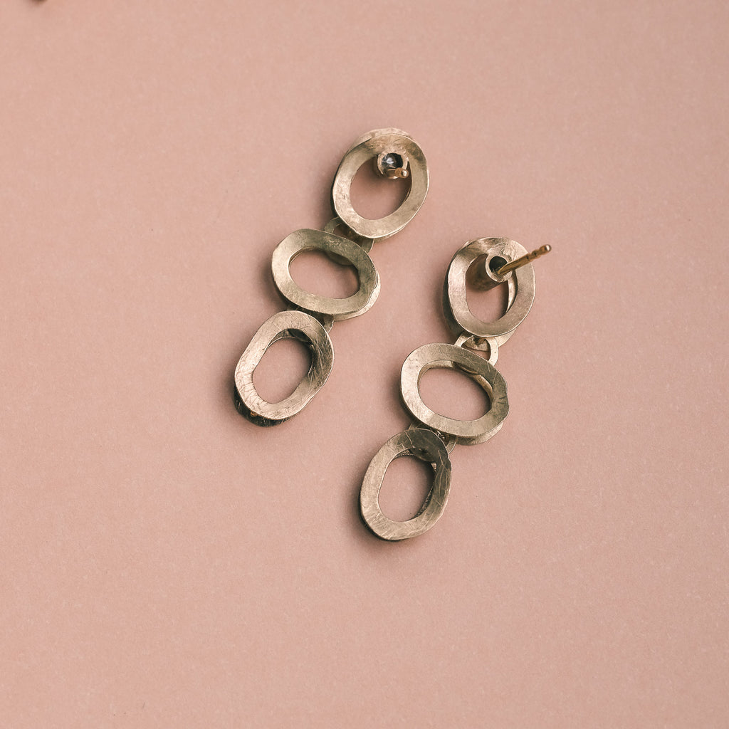 Playful modernist earrings formed of a series of interlocking ovals and each home to a single bezel-set icy white diamond. They are crafted in 18 carat gold throughout with a slightly textured finish, and date from the 1970s.