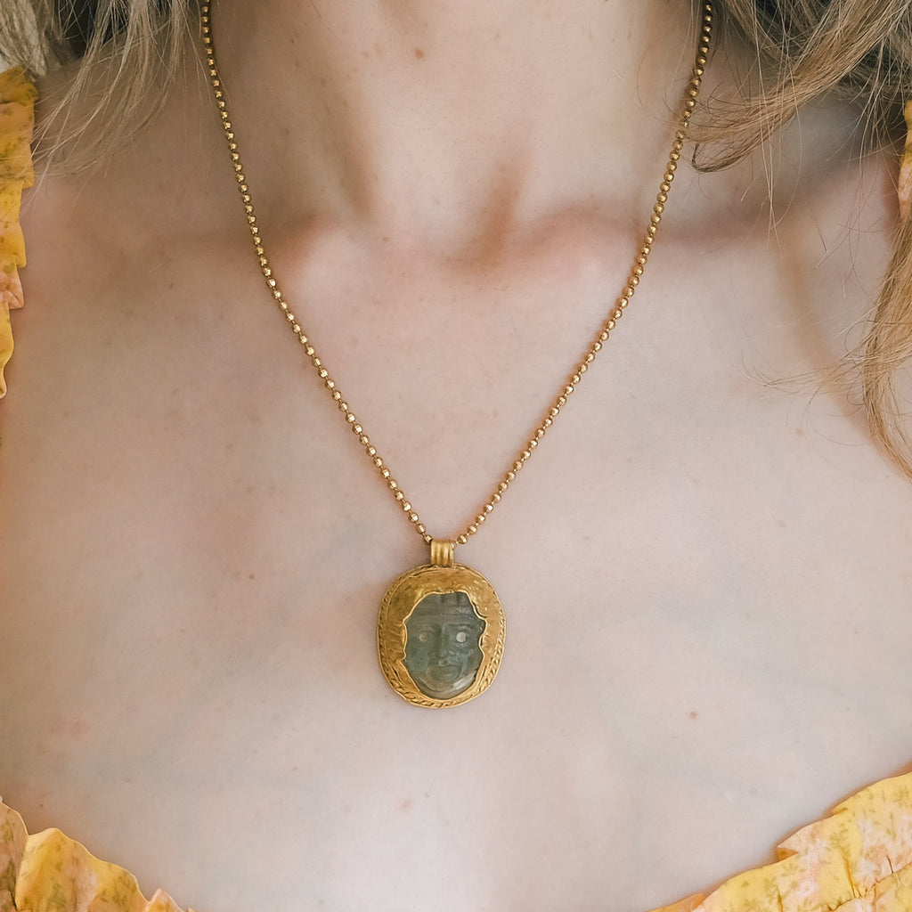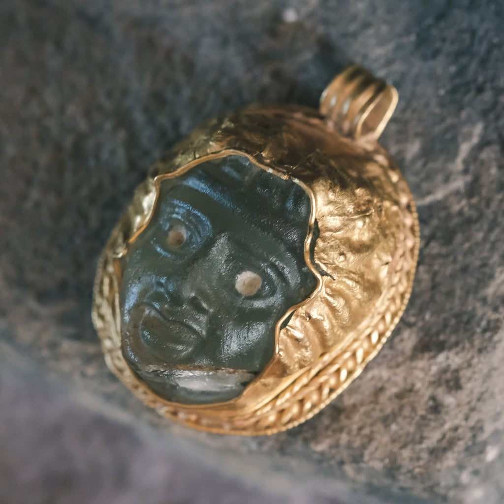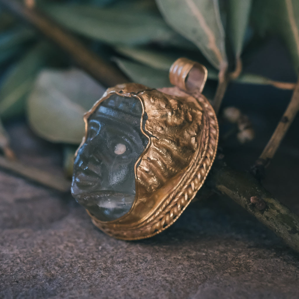 An utterly remarkable Roman pendant dated 1st century AD. It comprises are rare glass cameo bust of a man wearing a hood or hat, possibly a CucuIlātus or a pileus, made of textured gold. The face is expressive and exceptionally well carved, framed by the ruffled gold 'fabric' with five distinct rope-work loops, in various different forms - twisted, beaded, plain, etc. - forming the border. A reeded bail at the top allows it to hang from a chain.