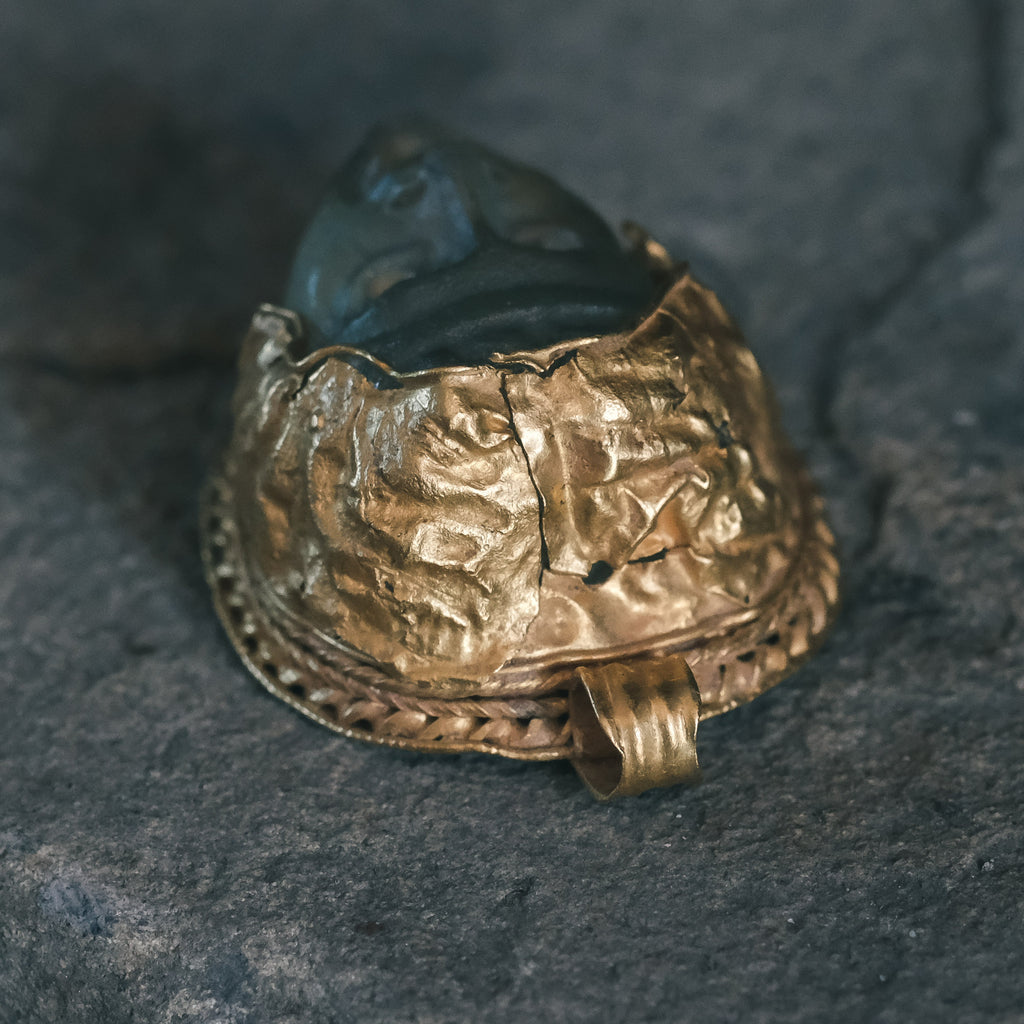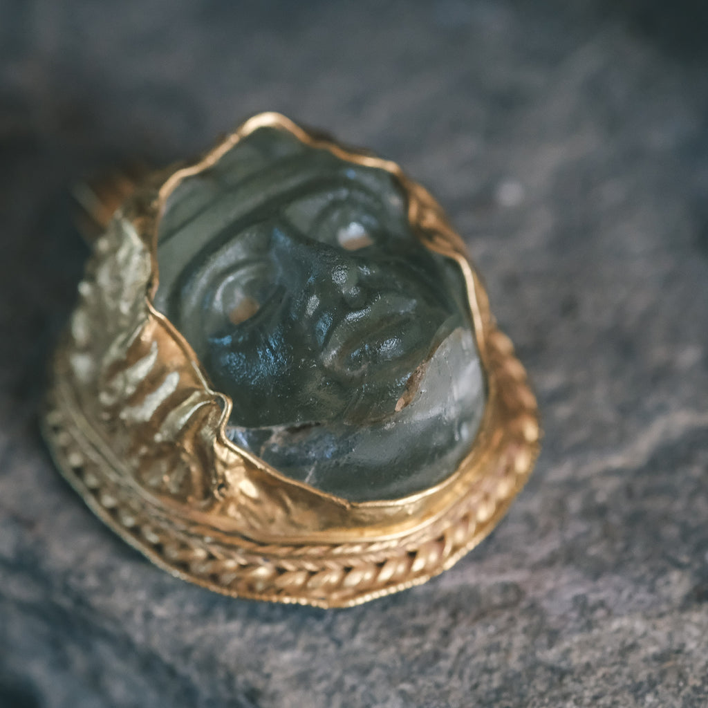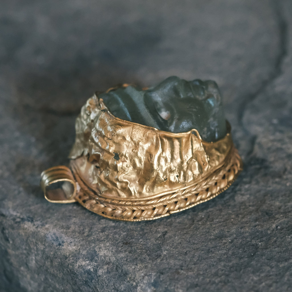 Condition: Good. This is an ancient artefact that is around 2000 years old with wear commensurate with age. The gold is split in places and the glass has taken a knock (or two) presenting with a crack running through it under the chin and some nibbles and conchoidal chips to the back. Please see images for an impression of the overall condition.