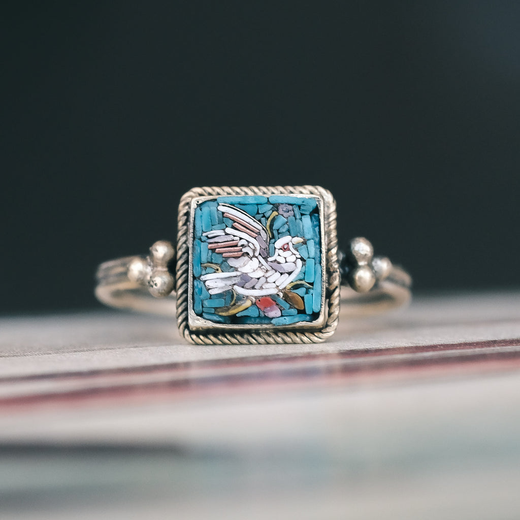Cool Victorian micromosaic ring dating from the latter half of the 19th century. The tiny, square mosaic panel depicts a colourful bird - perhaps a dove or pigeon - over a turquoise blue background. Specially shaped and multicoloured tesserae, known as millefiori, are used alongside the standard glass ones to make up the image. The metalwork is characterised by Etruscan elements: applied ropework border and granulation to the shoulders. It's crafted in silver with a pale gold wash.