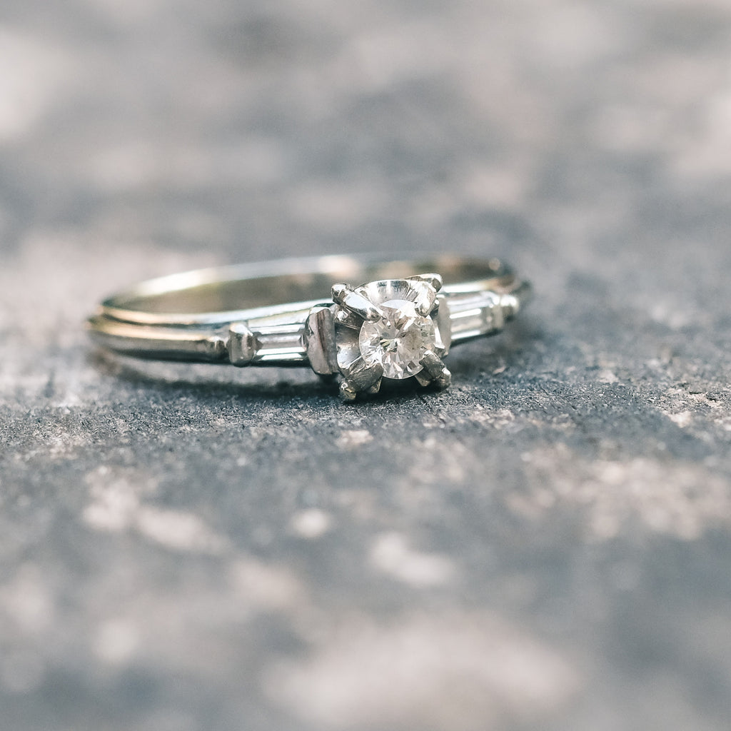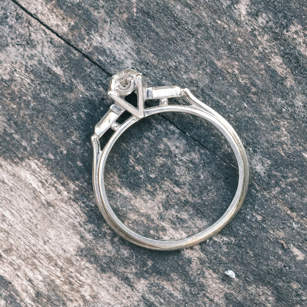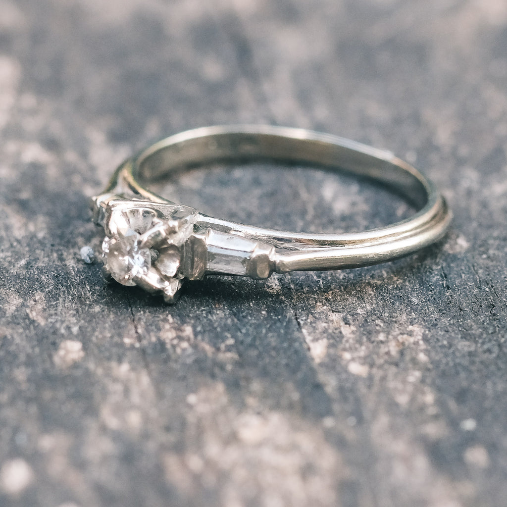 Elegant vintage diamond solitaire ring, dating from the mid-20th century. Crafted in bright 18 carat white gold, the ring features a central brilliant cut diamond flanked by two baguette cuts mounted east-west along the shoulders - all icy white and totalling 0.20 carats. With an openworked gallery and styling that gives more than a subtle nod to the 1920s, we think it would make the perfect engagement ring.