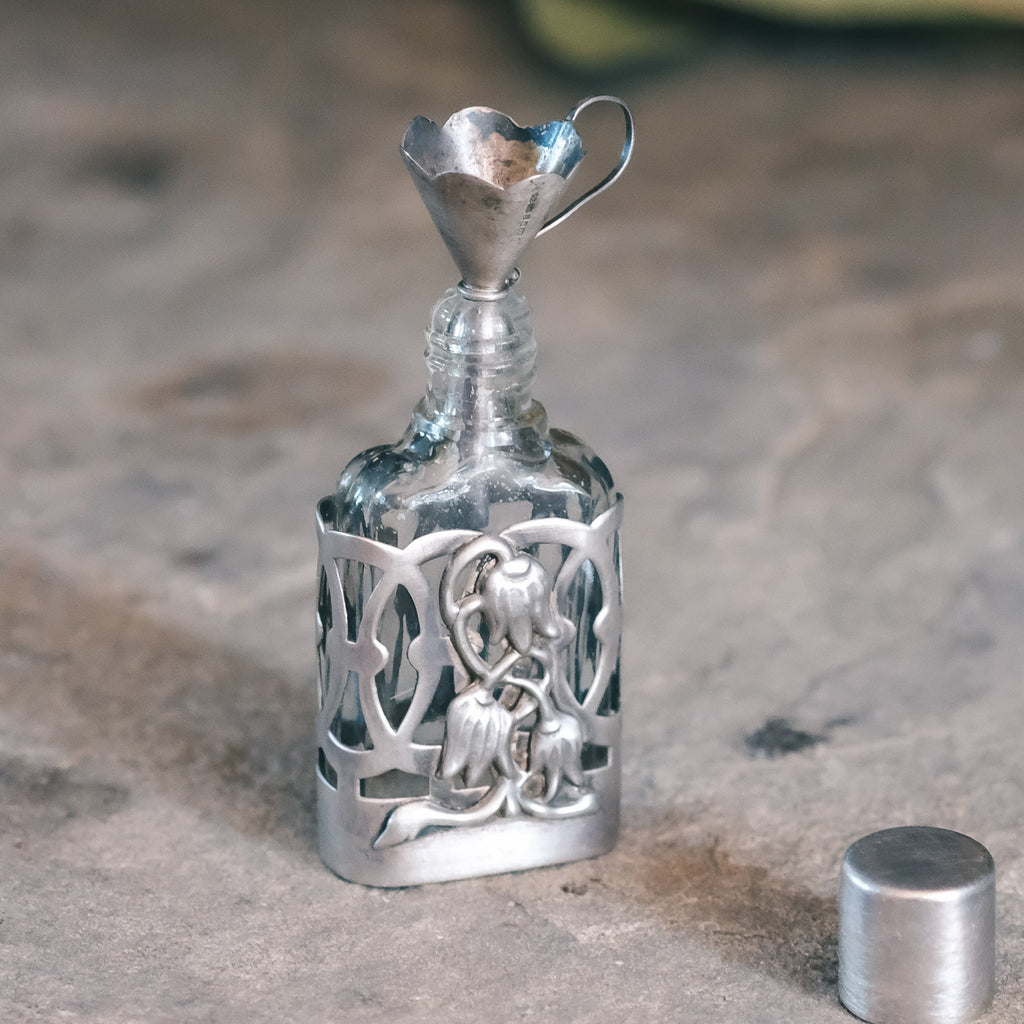 Charming glass scent bottle housed in a gorgeous Arts & Crafts inspired silver frame. It comes complete with a silver funnel and original silver screw top, the bottle itself cleverly designed to release the perfume drop by drop. The little glass bottle slips out of the silver housing, and each element is individually assayed for sterling silver.