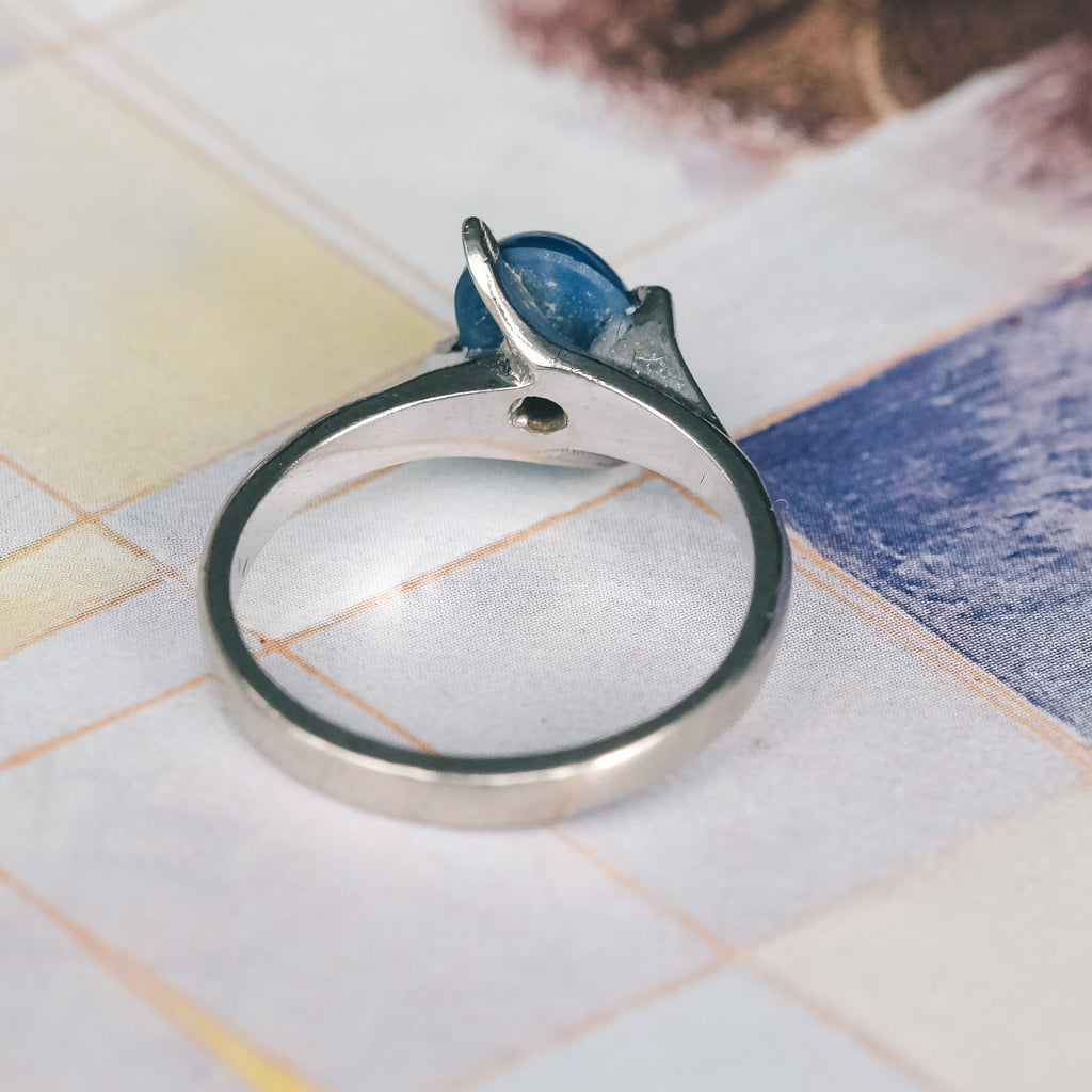 Vintage solitaire ring set with a beautiful star sapphire. It's crafted in 14ct white gold with a simple and sleek in design. The stone, a lab-grown example, displays a gorgeous royal blue colour with a crisp white star when held under a point light source.