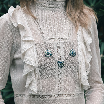 An Arts and Crafts period necklace featuring three shield-shaped panels finished in green, white, and blue vitreous enamel around a central olive-green chalcedony cabochon. It's long, 28 inches, in keeping with fashions of the time; crafted in sterling silver with a single baroque pearl drop hanging beneath the middle shield. The enamel is set over textured silver and shimmers with a delightful iridescent effect as the light shifts over its surface.