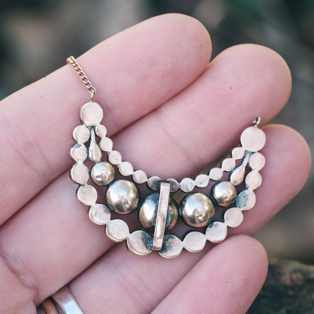 A large scale Georgian crescent pendant set with vivid, verdant green paste gemstones in individual dish-backed, cut-down settings (aka pie crusts). It dates from the turn of the 19th century with the stones set over metal foil to enhance their brightness. We've added a simple 9 carat gold curb chain, converting a brooch (with damaged fittings) into a necklace.