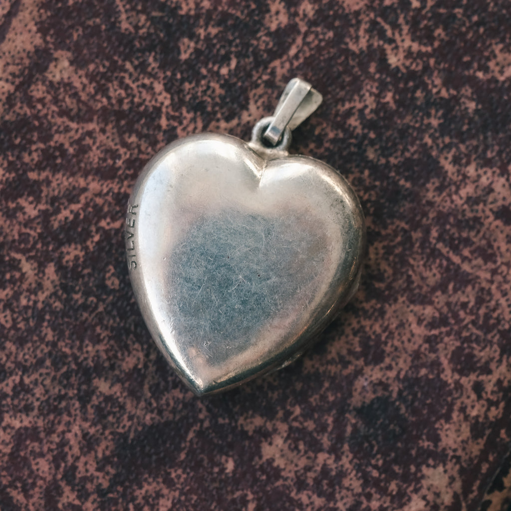Cute antique puffed heart locket crafted in solid sterling silver. The front is part-engraved with a floral motif, and it opens to reveal the original silver fittings inside. English, circa 1910.