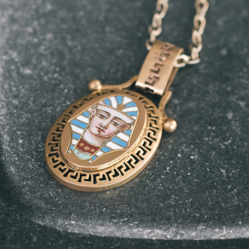 A remarkable Egyptian Revival pendant dating from the 1920s. The depicted Pharaoh is quite a vibe, beautifully rendered in colourful, hand-painted enamel looking slightly forlorn with eyes cast downwards and to the side. He's bordered by a pierced greek key motif and hangs from a period barrel clasp chain. The 1920s Egyptomania that possessed Europe and the US was sparked by a single discovery in 1922: the (mostly) untouched tomb of Tutankhamun, the young Pharoah who ruled Egypt from c1332-1323. And it is said boy-King that we're looking at here.