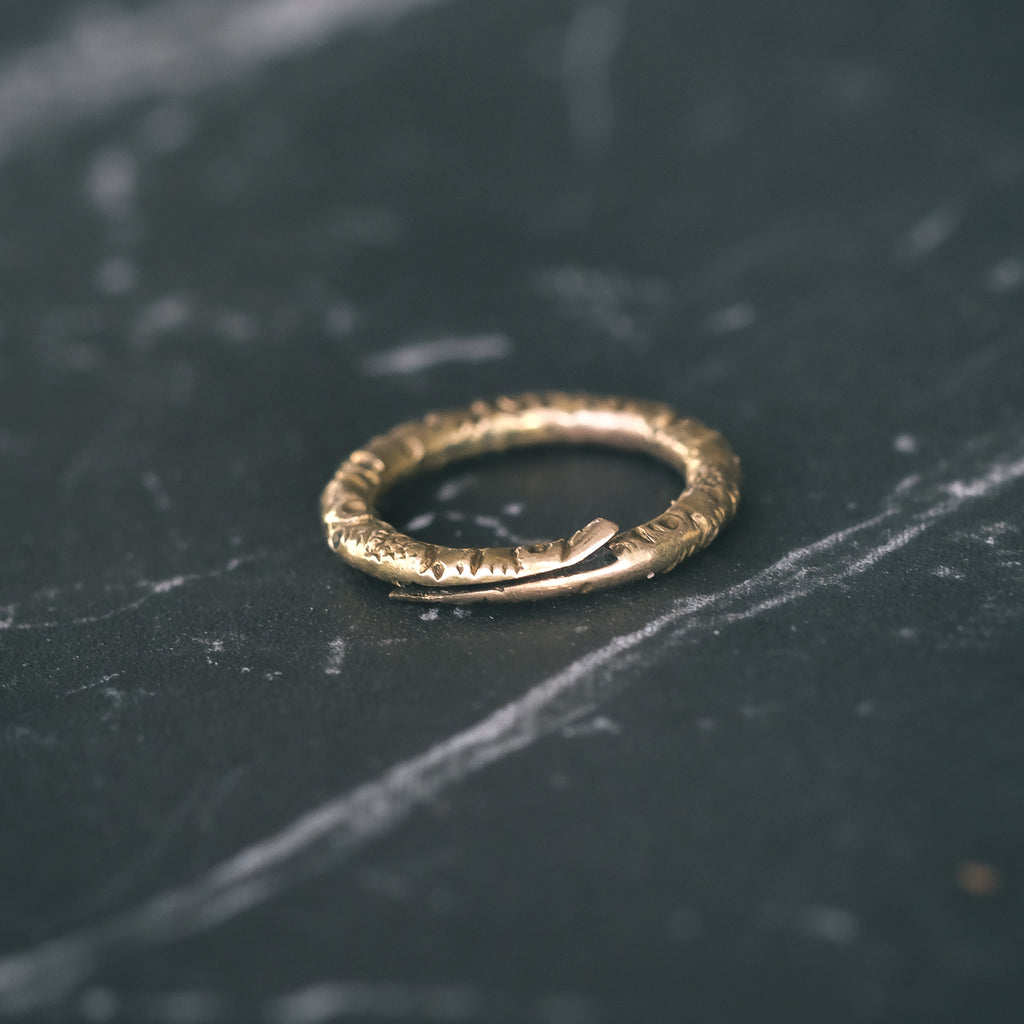 15 carat gold Georgian split ring with chased foliate details. These little split rings in solid, high carat gold are like hen's teeth (as it were). It's basically a little gold ring that functions like a keyring with a 'split' down the part of its circumference, allowing for charms, ends of chains, fobs, whatever you like really, to be threaded onto the ring. People have used them over the preceding centuries to hold charm collections on a necklace chain or bracelet, or to extend/combine/link up etc etc various different pieces into new and novel combinations. This one dates from the early 19th century - somewhere around 1820 - with pretty, swirling, floral designs carved into each side.