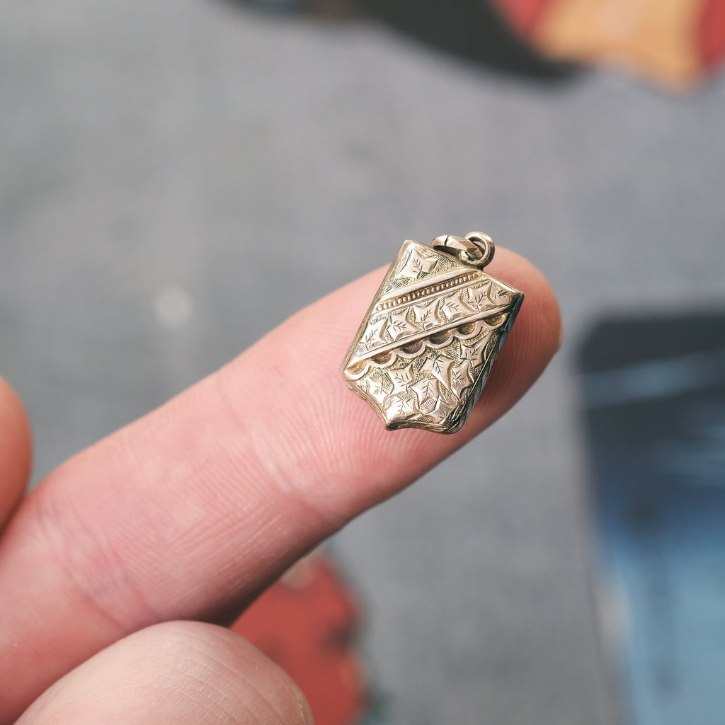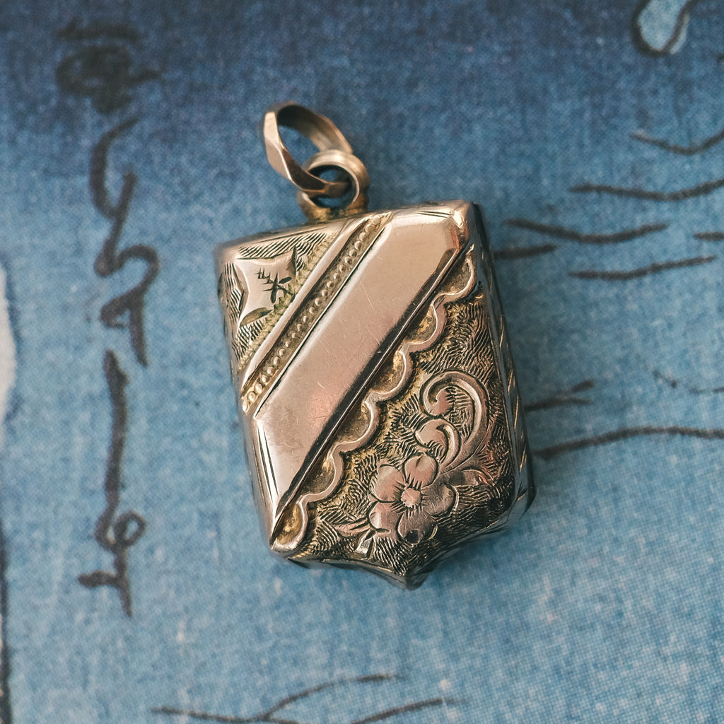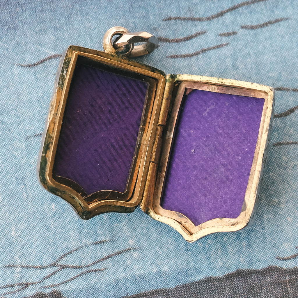 A sweet miniature shield locket dating from the latter half of the 19th century. The front and back are intricately engraved with ivy leaves and a forget-me-not flower. The ivy (per the Victorian Language of Flowers) represents fidelity, for nothing but death can separate ivy, once it has embraced the tree (or wall), from its chosen companion. As far as sentiments went, fidelity was a biggie for the Victorians, and ivy leaves appeared everywhere from jewellery to paintings to poetry, often accompanied by the words I Cling To Thee, or, Nothing Can Detach Me From You. The forget-me-not is an enduring emblem of true love and remembrance and was a popular motif of the sentimental Victorian era.