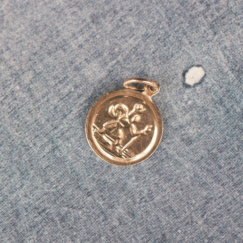Miniature vintage gold charm of St Christopher dating from the 1970s and crafted in 9 carat gold with faceted 'diamond-cut' border that glistens as it catches the light.