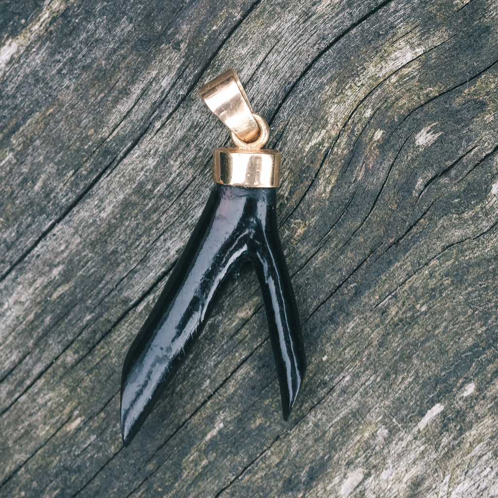 A forked branch of rare black coral hangs from 18 carat gold fittings. Dating from the late Victorian period, it's an unusual (and decidedly gothic) spin on the popular red coral talisman.