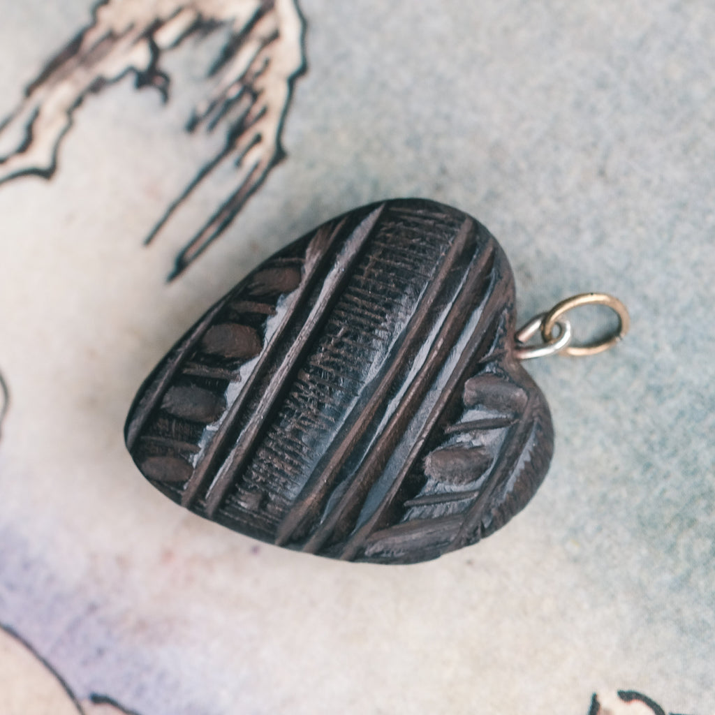 Bog oak is a fossilised wood (or peat) that was used to make jewellery by the Victorians. It was an obvious choice, easy to carve and the deep brown or black colour - like jet or gutta-percha - made it perfect for mourning jewellery. This Victorian bog oak pendant is carved as a heart decorated with textured diagonal stripes to the back and cross-hatching. A single amethyst cabochon adorns the front.
