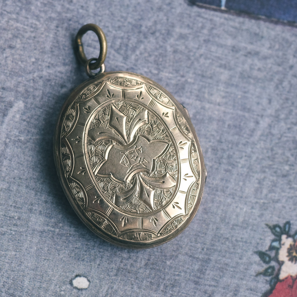 Beautiful Victorian locket with wonderfully intricate engraved floral detailing and seams of royal blue enamel following its oval shape. The reverse is similarly engraved around a cartouche containing the monogram EC or CE. It opens to reveal the original fittings and glass and a loop of woven hair.