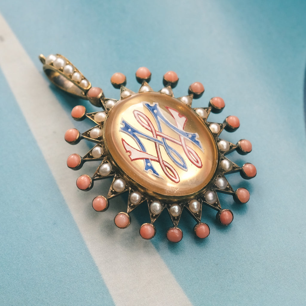 A remarkable 19th century locket crafted in the high Victorian style. At its heart lies an Essex crystal monogram - WM or MW - the initials reverse carved into the base of a domed rock crystal cabochon and then painted. The back is an oval glass locket compartment and the sun-ray border is set with gemstones of the sea - coral and pearl. It's crafted in 18 carat and dates from the 1860s.