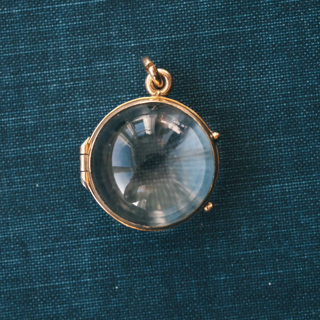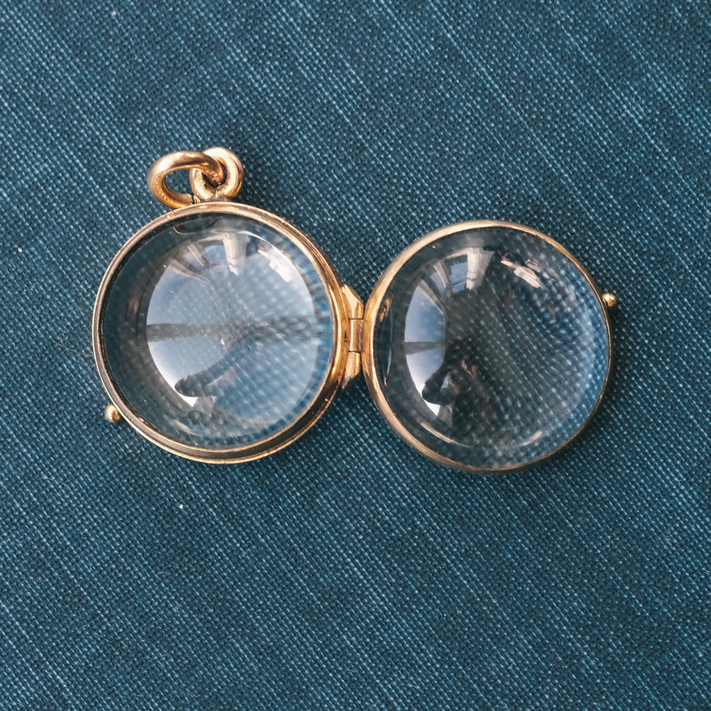 Charming and rare Victorian pools-of-light locket dating from the latter half of the 19th century, circa 1870. The domed glass panels, front and back, are designed to capture 'pools' of light within. They also have the effect of magnifying whatever you choose to place inside - a photograph, lock of hair, etc.