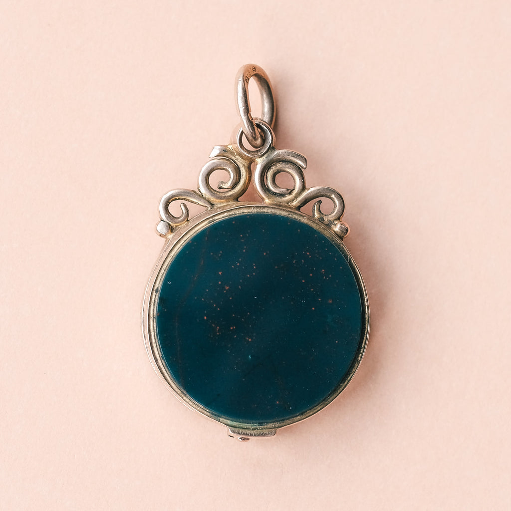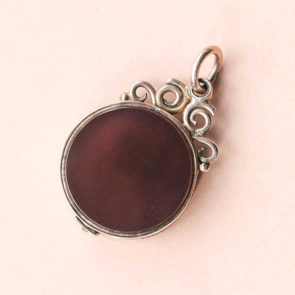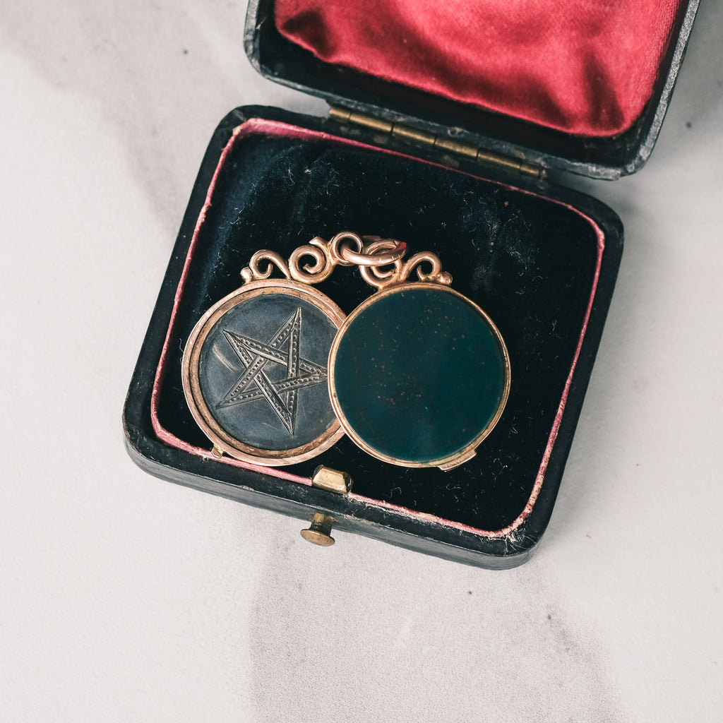 A rather inconspicuous looking (though very lovely) Victorian fob pendant that slides open to reveal a hidden Masonic pentagram etched into a metal disc inside. It's crafted in 9 carat gold with a scrolled frame at the top and two agate panels forming the front and back: one bloodstone, one carnelian.