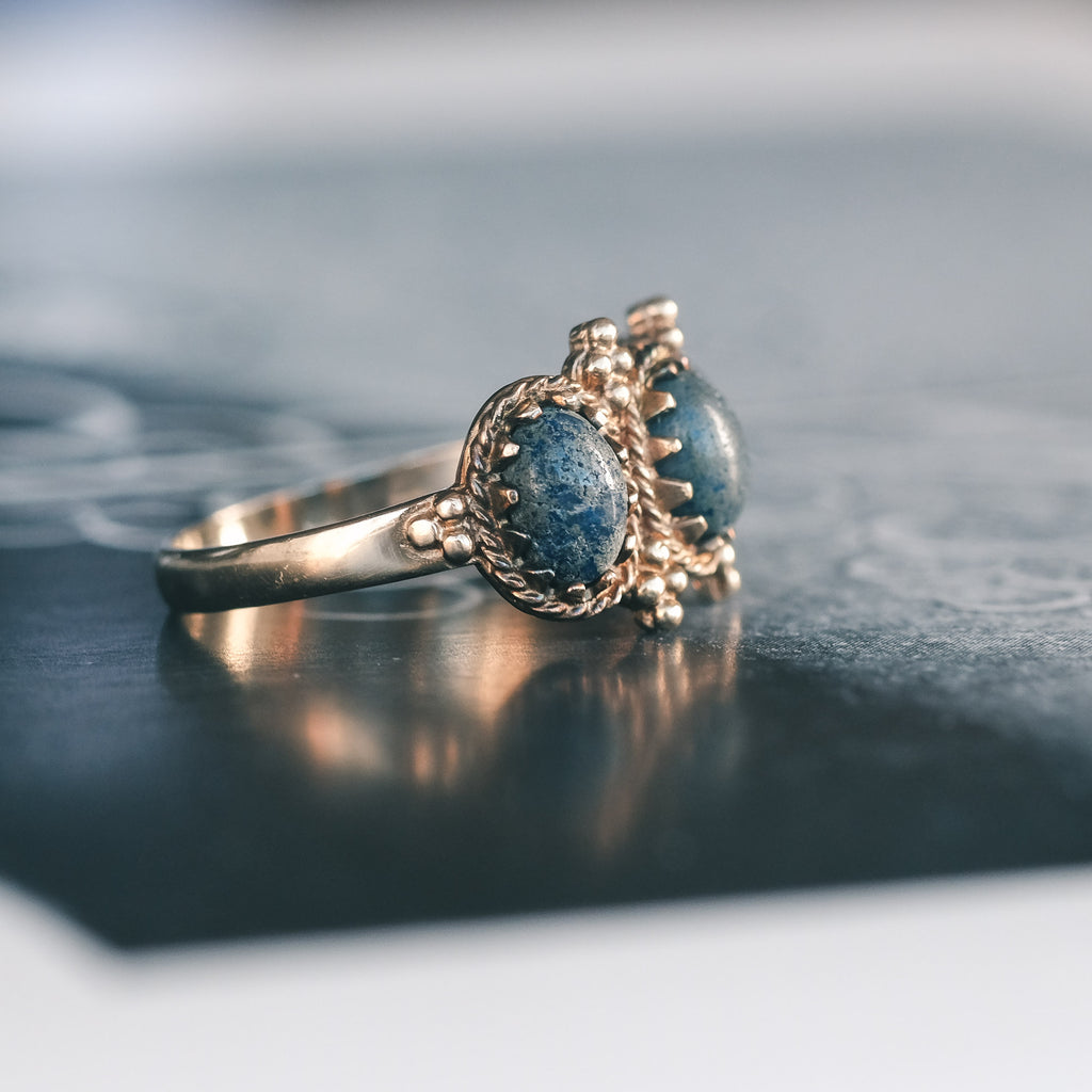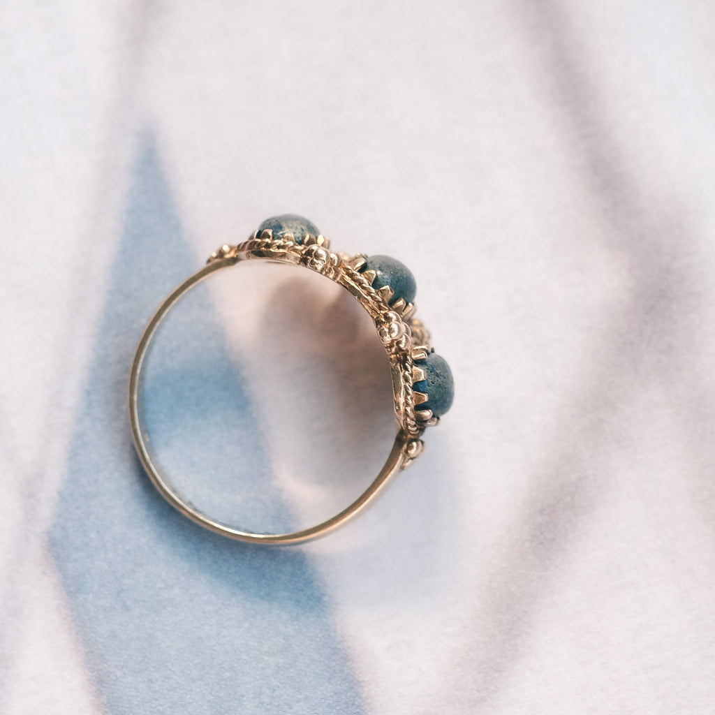 Cool ancient revival three-stone ring dating from the 1980s. Jewellery of the 1970s and '80s saw a mini Victorian Revival, with styles mimicking 19th century themes and designs. Including, apparently, an Etruscan Revival revival. This ring is testament to that, with its ropework borders and granulation, and its creator even managed to 'age' the lapis stones and give the gold a giallone, darkened finish to perfectly complete its ancient aesthetic.