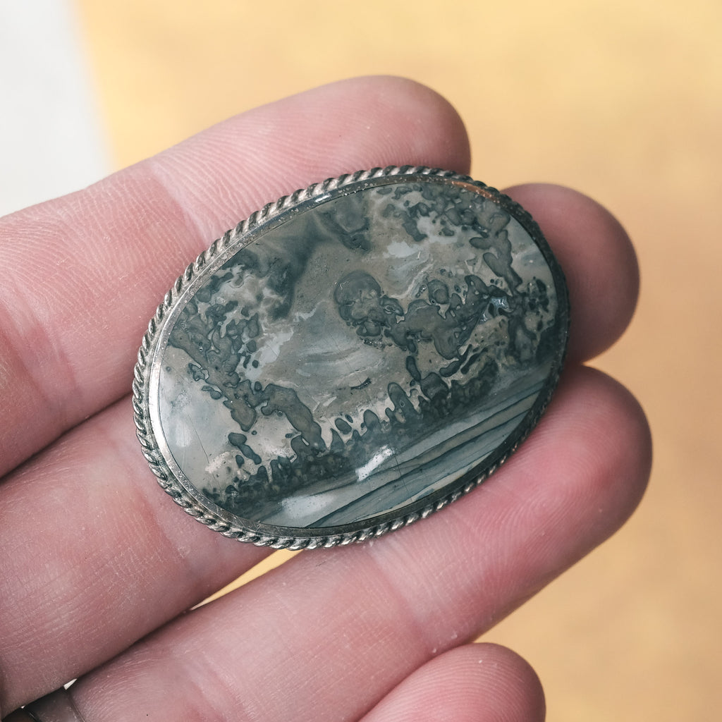 An utterly remarkable agate specimen brooch with what's known as a 'Landscape Agate'. But this one's somewhat different to any I've seen before: it's an industrial dystopian hell-scape agate with a city, a dense urban jungle, visible in the distance spewing out dark smoke behind a grey, desolate wasteland. The stone rests in an silver collet mount with applied rope-twist border