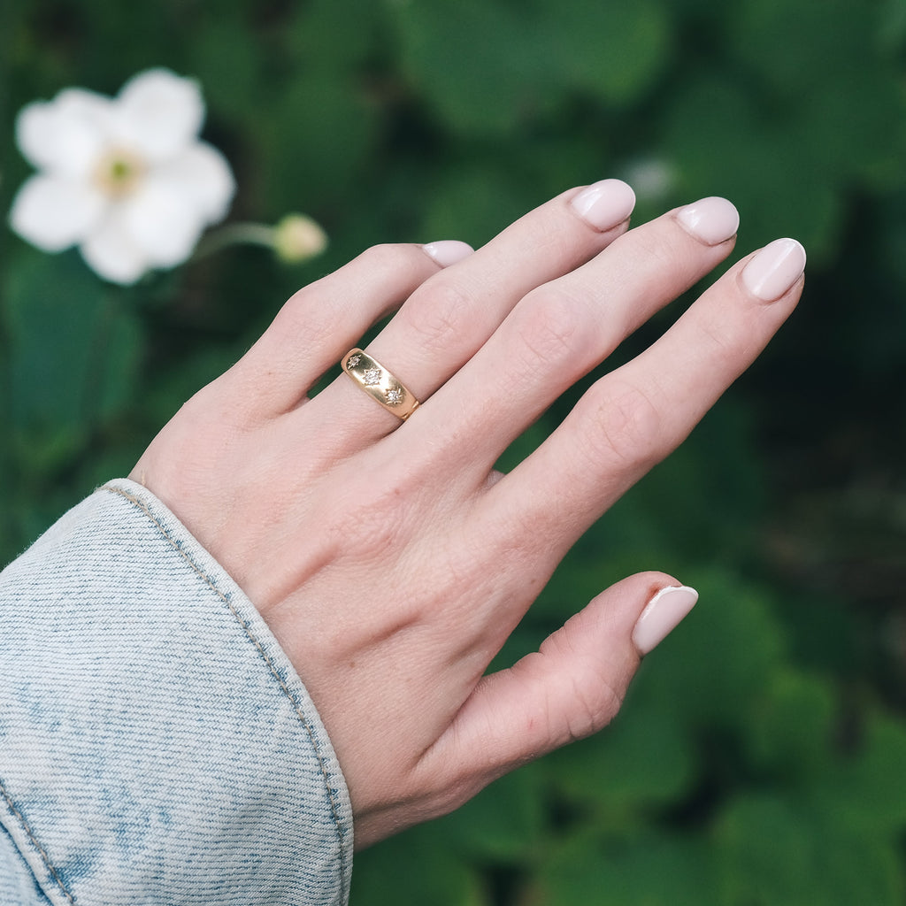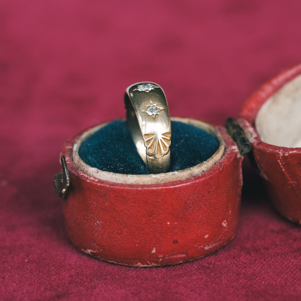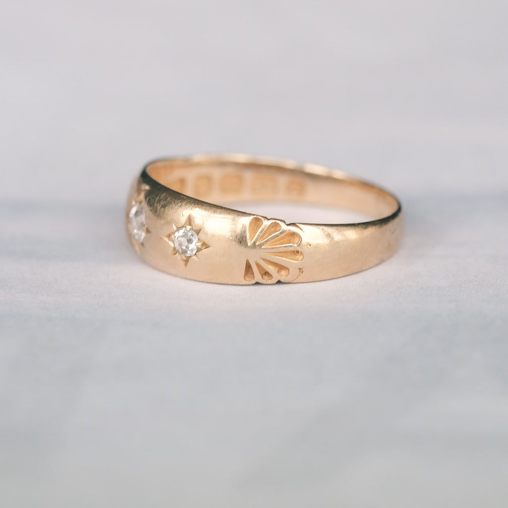 Gorgeous gold band set with a row of three old mine cut diamonds - flush set - in carved star settings with delicately engraved shoulders resembling seashells. The diamonds are bright and icy-white, complemented beautifully by the buttery 18 carat gold of the band which has taken on a wonderful soft patina over the years. Made in Birmingham, England, in 1892.