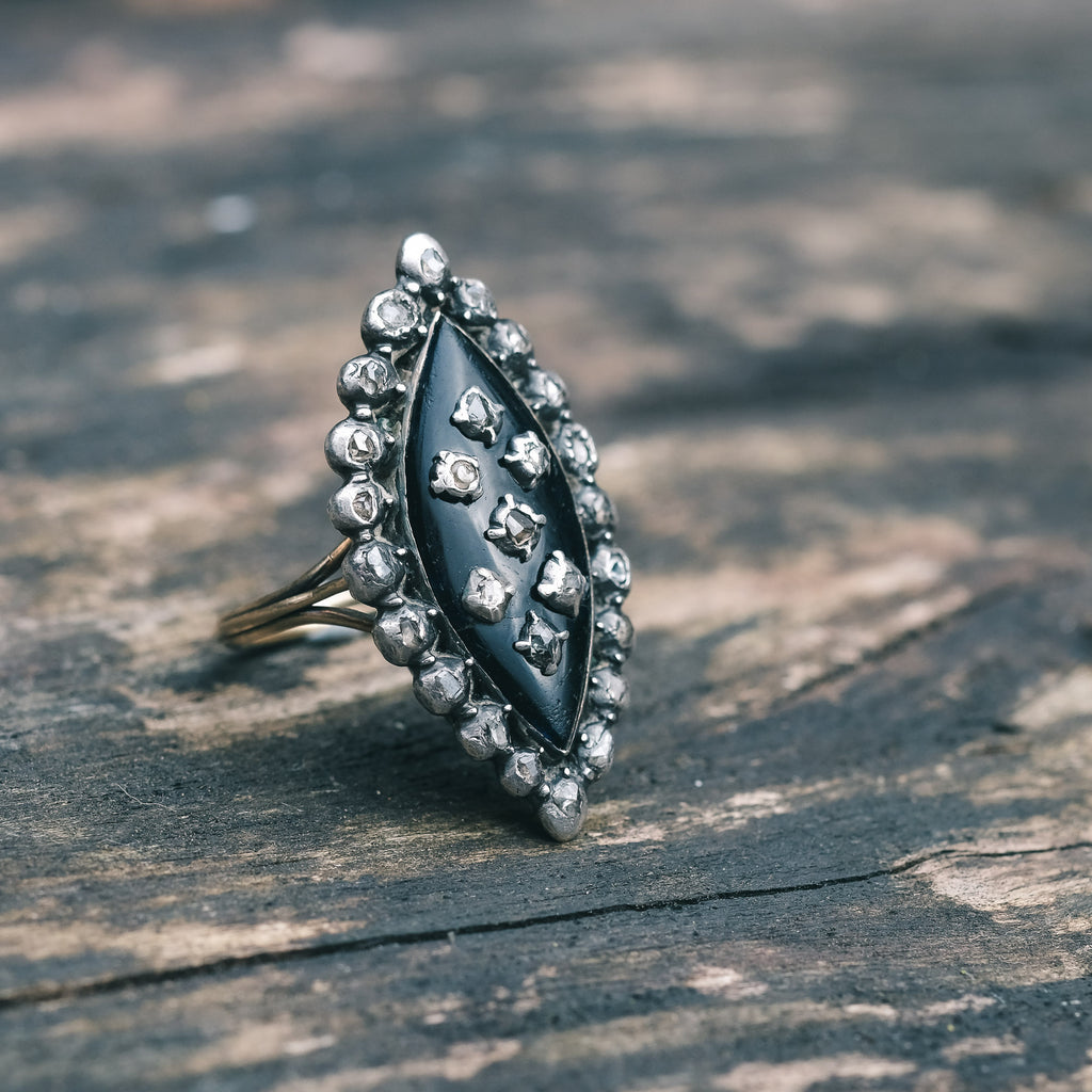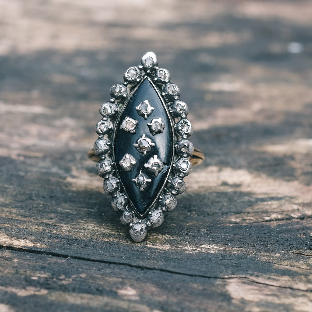 "Two innovations from France were the 'firmament' and enfantement rings, designed respectively to celebrate the good news that King Louis XVI and his wife, Marie-Antoinette, were expecting an heir and then the birth of the Dauphin in 1785. Whereas in the firmament ring numerous small diamonds are applied on the ground so they shine out like the moon and stars in the sky at night, the enfantement ring has only one large stone amidst smaller stones applied to the centre."
