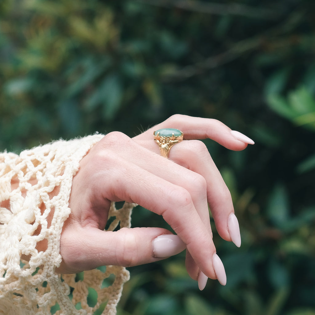 Gorgeous jade ring set with a large, juicy cabochon displaying a superb mottled colour that lies somewhere between pale and apple-green. The detail is exceptional, with shell motifs to the shoulders and an openwork gallery - the overall effect, coupled with the rich and silky 22 carat gold, is pretty special. It dates from the Art Deco period, circa 1930.