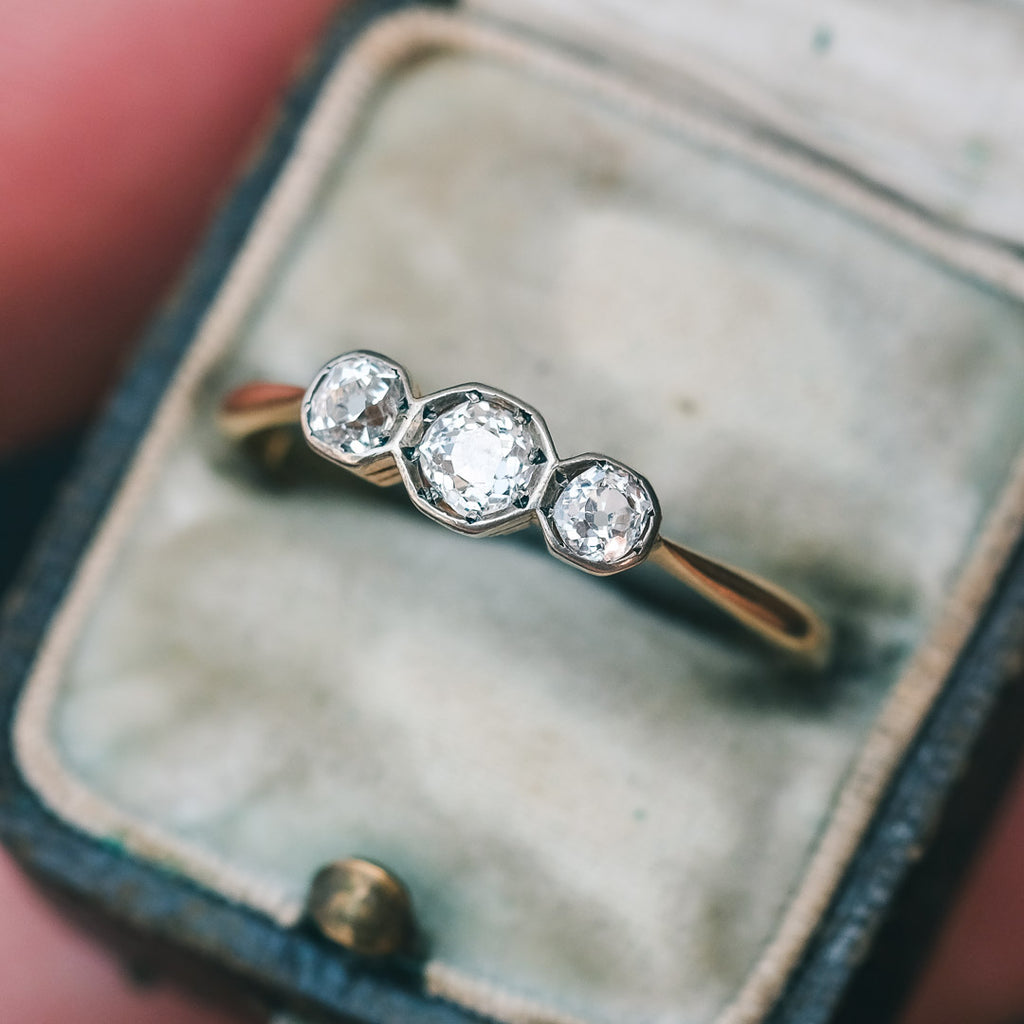 A gorgeous antique diamond trilogy ring set with three bright, icy white diamonds in octagonal bezels. It dates from the art deco era, circa 1920, and is crafted in rich 18 carat gold, with platinum octagon bezel settings that give it a sleek and minimalist, quintessentially Art Deco, geometric feel.
