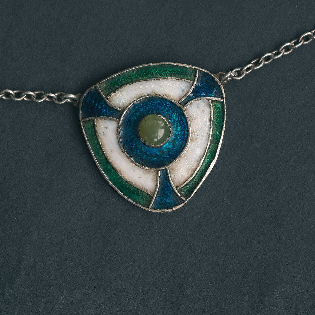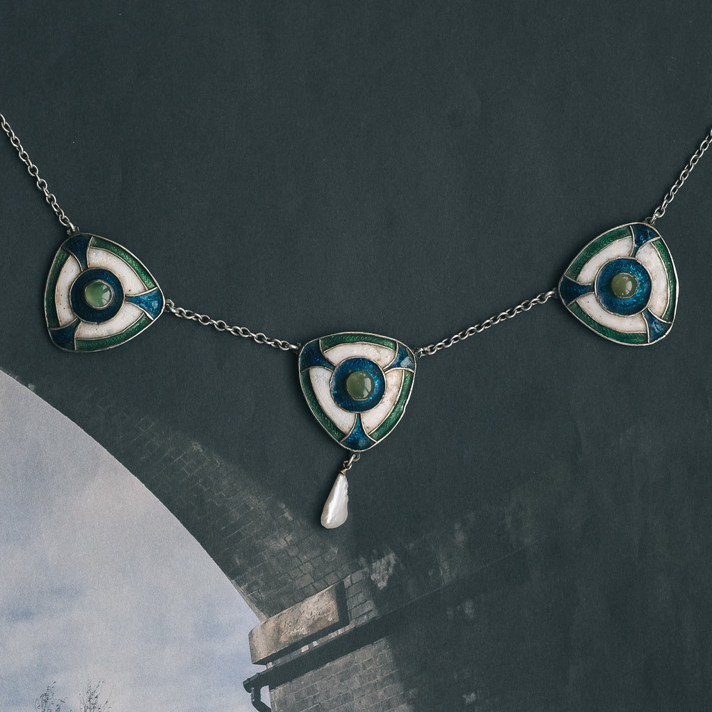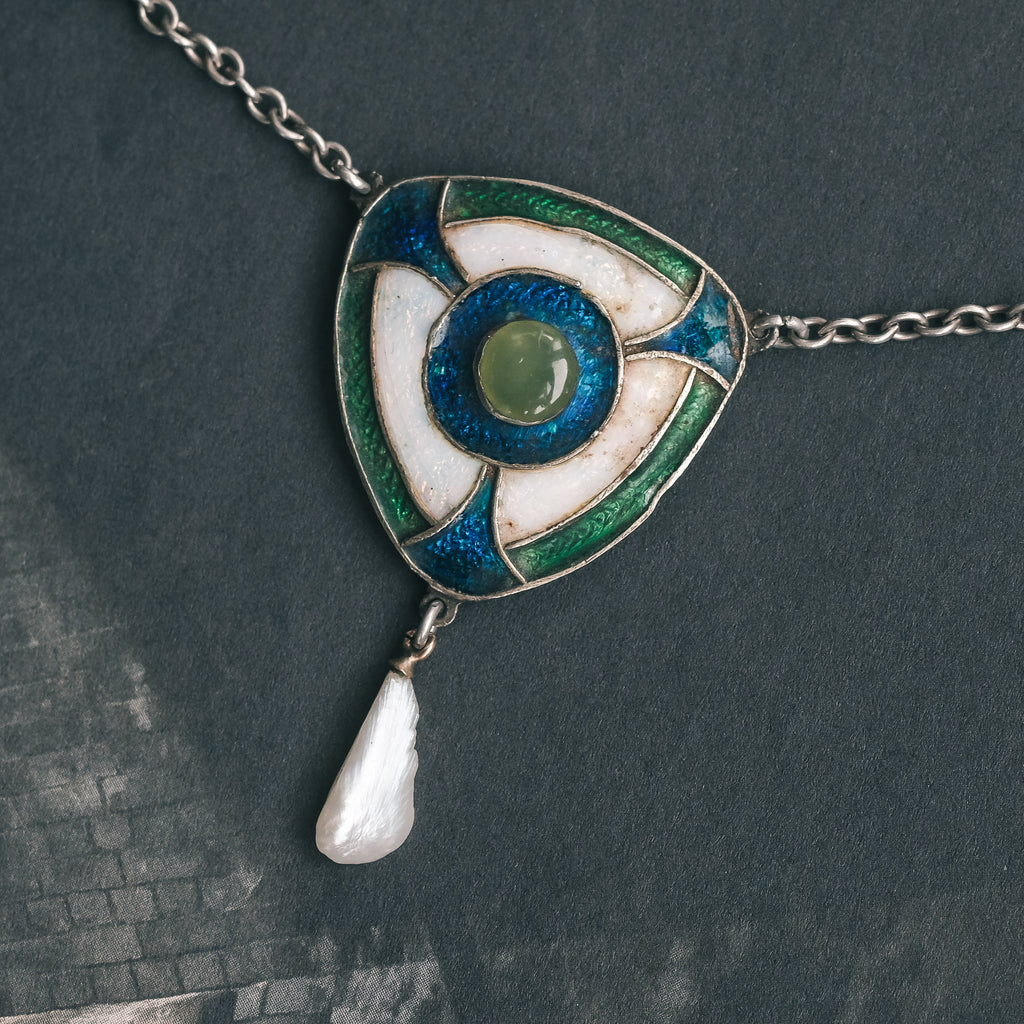 An Arts and Crafts period necklace featuring three shield-shaped panels finished in green, white, and blue vitreous enamel around a central olive-green chalcedony cabochon. It's long, 28 inches, in keeping with fashions of the time; crafted in sterling silver with a single baroque pearl drop hanging beneath the middle shield. The enamel is set over textured silver and shimmers with a delightful iridescent effect as the light shifts over its surface.