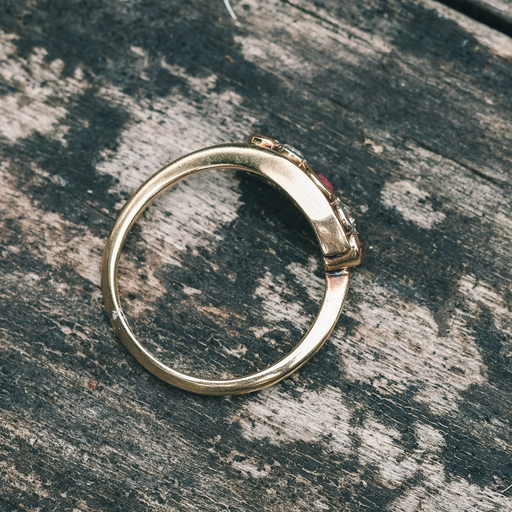Stunning 5-stone crossover ring dating from the Edwardian period, circa 1910. The head features three juicy, raspberry-pink rubies punctuated by two icy Old European cut diamonds, with graceful, fluid curves that swoop around the head, each one connecting on the opposite side. The style is very much reminiscent of the Art Nouveau tradition, however unusually displays five-stones which we see much more rarely than its two or three-stone counterparts.