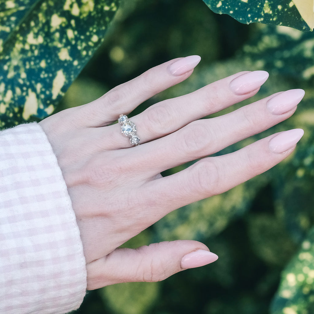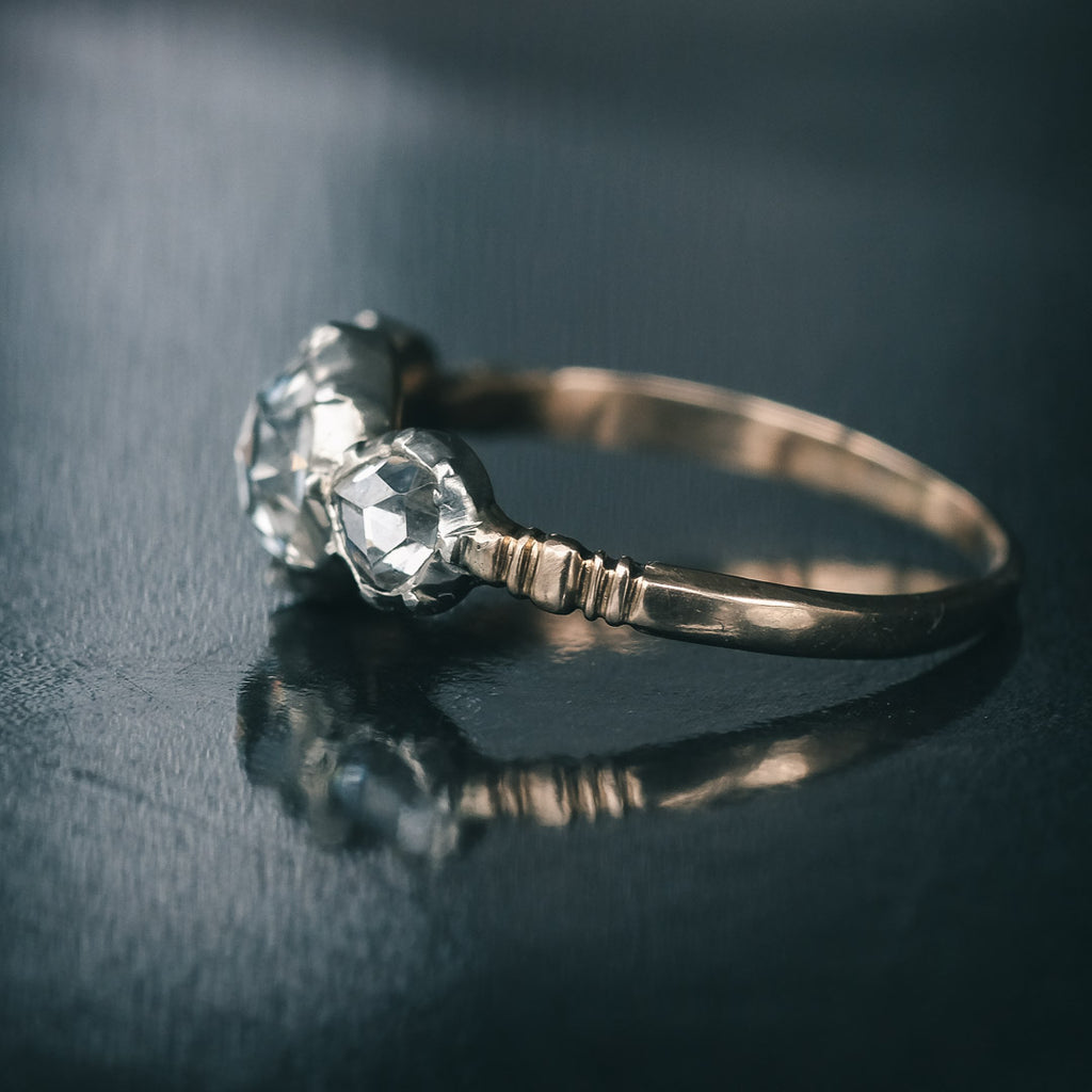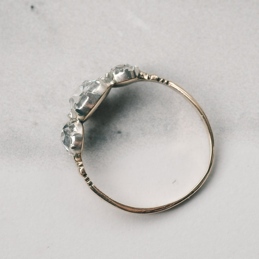 A rare and exquisite Georgian ring with three dazzling domed rose cut diamonds in cut down ‘pie-crust’ settings. The stones are set over silver foil and remain as bright as the day it was made (indeed, the ring has clearly been polished quite recently as the silver shows no signs of tarnish/oxidation). The 15 carat gold band features elegant detailing to the shoulders, its warmth setting up a gorgeous tone contrast with the bright stones and cool sheen of the silver.