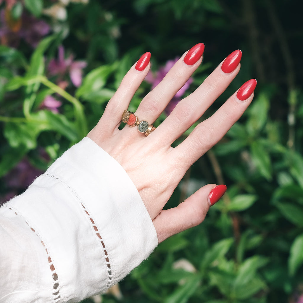 An astonishing Grand Tour period "Days of the Week" ring set in yellow gold and dating from the early 19th century, circa 1820. Seven cameo busts - carved from coloured Vesuvian lava and coral - are set in simple rub-over settings, each one depicting a classical god or goddess: Venus in white for Friday, Saturn for Saturday, in light olive; Sunday represented by Apollo (aka Sol) carved in coral; Monday is Diana (Luna) in grey; Tuesday is Mars; Wednesday is Mercury; Thursday is Jupiter (black). These rings were made in Naples for the Grand Tourists, the region being known for its long lineage of gemstone carvers.