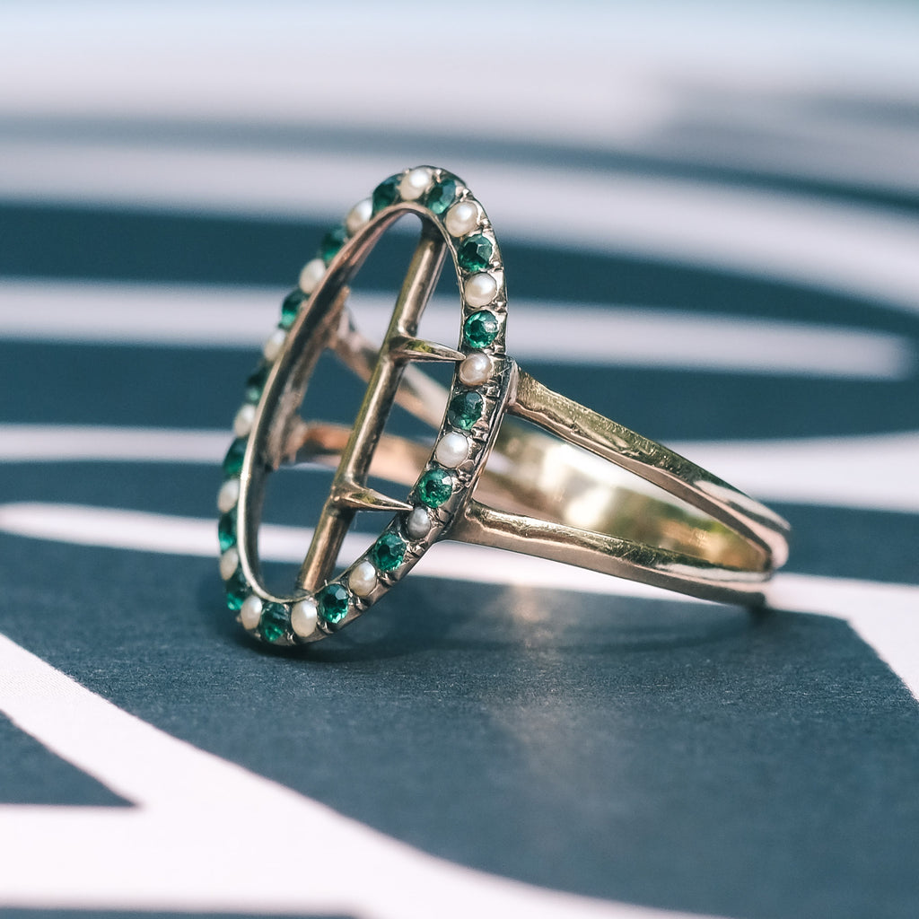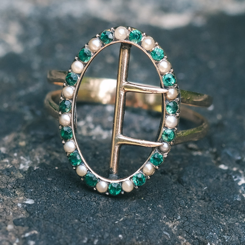An unusual gold buckle ring converted from a 19th century piece of jewellery. The buckle is finely worked in 15 carat gold and framed by a halo of alternating emeralds and pearls with a double claw fastener in the middle. An elegant double band, split at the shoulders, has been recently added for wear as a finger ring. With London hallmarks and a C&J maker's mark stamped inside the band.