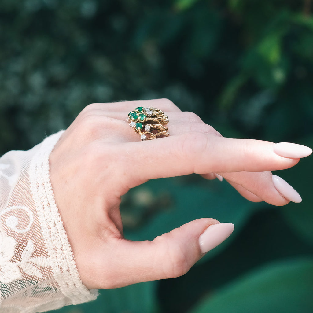Condition: Good vintage condition with wear consistent with age. One emerald has a (stable) surface reaching fracture and two are chipped - they remain securely set