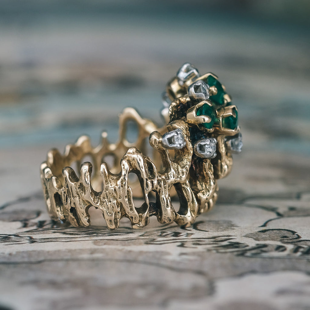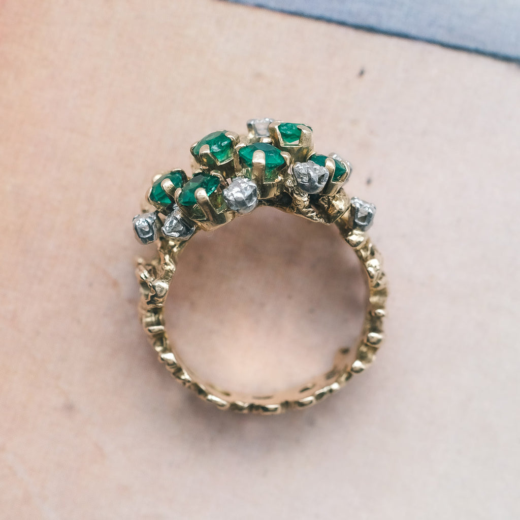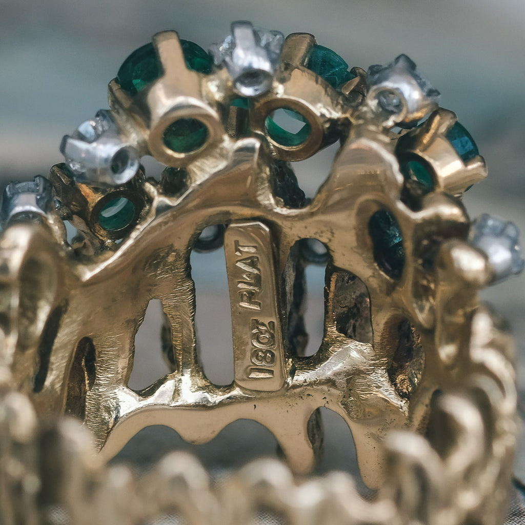 This ring was made by another post-war modernist goldsmith: George Weil. It's sculptural and textured, drips of molten gold punctuated by flashes of emerald green and ice white. The plate affixed behind the head states simply, 18ct and PLAT; Mary Anne Wingfield notes that "... in keeping with a great deal of Weils' work, [it] does not carry an assay mark. I always found this odd, given that Weil worked out of Hatton Garden, which is dominated by the London Assay Office. How difficult would it have been to pay the office a visit occasionally?"