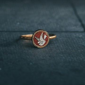 Micromosaic ring depicting a white dover over scarlet tesserae background. Mounted in an 18 carat gold ring with ropework border around the bezel setting.