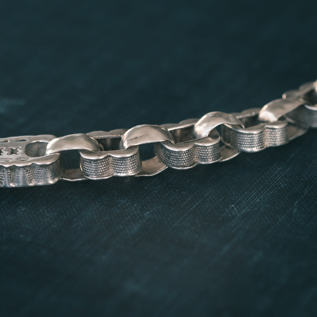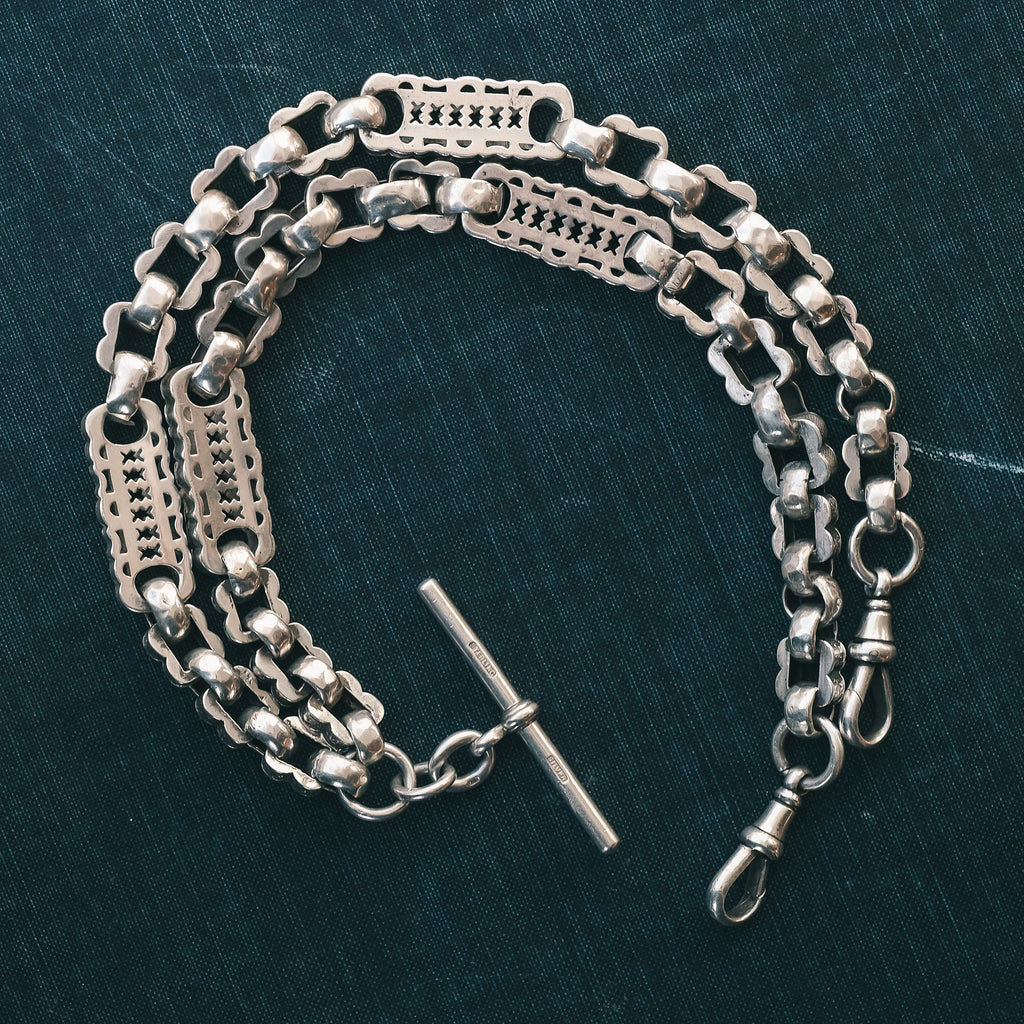 Chunky fancy-link double Albert chain in sterling silver. It's long and heavy - 19 inches and 52 grams respectively - with two dog clips and a T-bar and textured box links decorated with stars and pierced openwork. The T-bar is stamped STERLING SILVER and the other components are variously hallmarked with the lion passant and date letters etc. A rare example of the style; it would have made a helluva statement worn over a waistcoat as a watch chain.