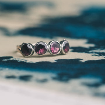 Charming Georgian ring set with a row of four burgundy flat cut garnets. The stones are set over foil, giving them a brooding and mysterious glow as the light reflects back out, and they are mounted in rustic collet/bezel settings typical of the period. The band is simply decorated with split shoulders and crafted in 9 carat gold. English, circa 1800.