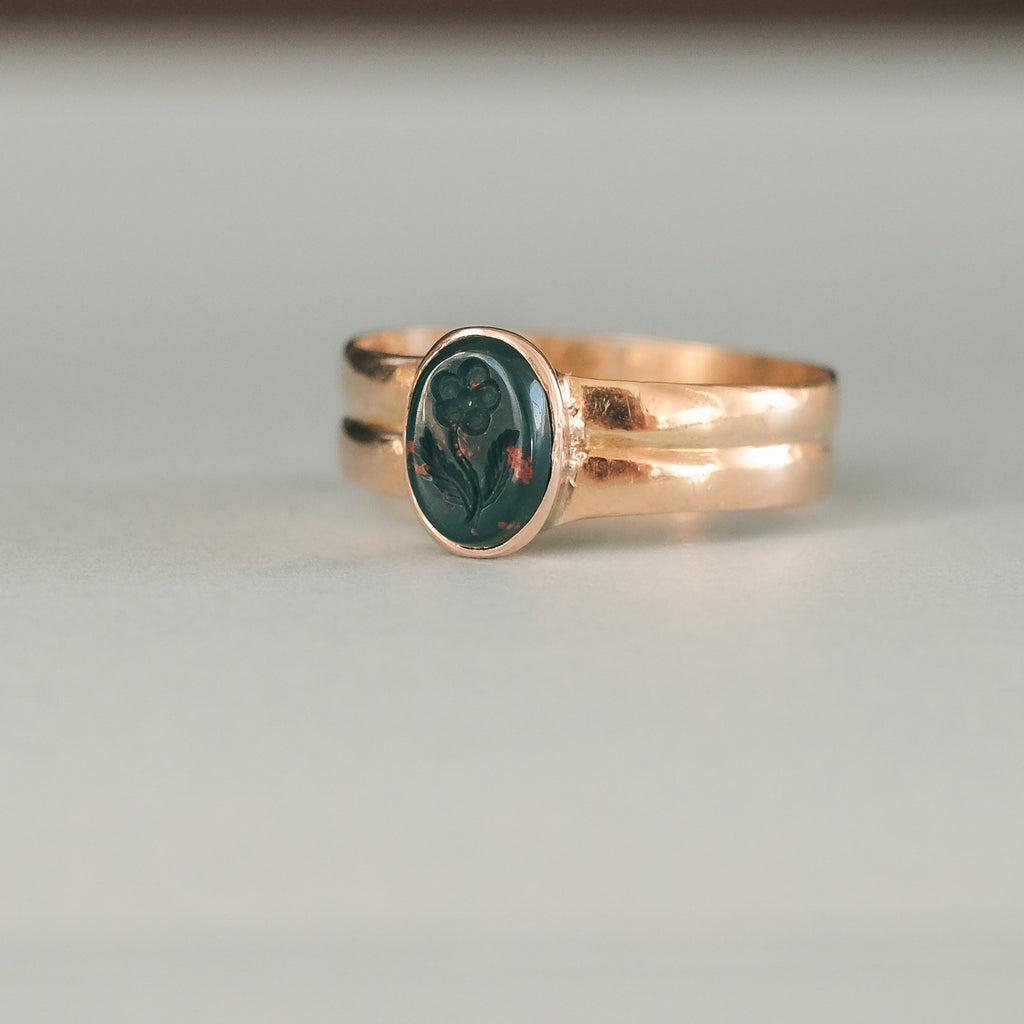 A signet ring by Lost Owl. We came across this remarkable antique ring in need of a little TLC. It's made from two 22ct gold wedding bands, fused together with an oval collet that was empty. The original bands were likely owned by a couple, two people now lost to history, but who shared an intimate and eternal bond - their relationship now commemorated by this ring. We added a bloodstone panel and engraved a tiny forget-me-not flower in keeping with the sentiment already attached to the rings.