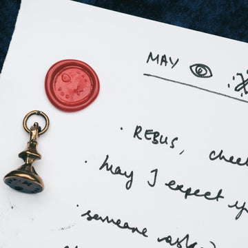 These miniature seal fobs came to us as a twenty piece collection, likely owned by a scribe. The Georgian Regency era, officially 1811-1820, arguably saw the pinnacle of letter writing. The educated upper classes would have been able to write their own letters, and indeed seal them closed with their own personal intaglio (perhaps a family crest or monogram, or, if titled, their own heraldic shield), but anyone else who wanted to correspond via letter was unlikely to have learned to read and write, so would have employed the services of their local scribe. For a small fee, the scribe would write down a dictated letter, then offer the sender a choice of seals by which to secure the envelope. The seals would, then, have to convey a broad selection of messages - some serious, some jovial, some thoroughly tongue in cheek - and not being from the upper classes themselves, the scribe certainly wouldn't have had the financial means to purchase a set of solid gold seal fobs... gold cased or gilt would certainly have done the job.