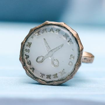 Georgian Regency era miniature seal fob set with a white glass "Tassie" intaglio to the base. The seal, reversed to form an imprint in wax, shows a pair of scissors along with the words WE PART TO MEET AGAIN, a hope and belief in future union. Because the scissors' blades literally "part to meet again", and, to extend the metaphor, the parting of the scissors' blades is usually brief, before they're closed again to safely conceal the blades. The fob is crafted in gilt metal with ornate, rococo-inspired styling typical of the period.